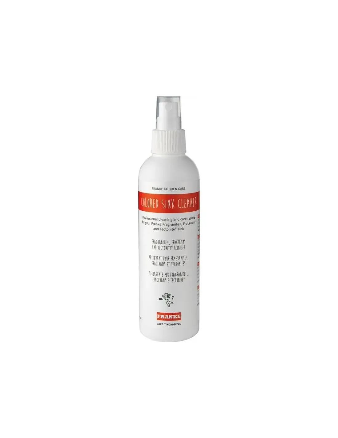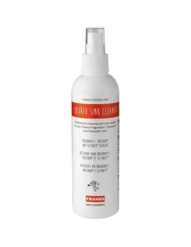 Środek do zlewozmywaków kolorowych. Środek jest przeznaczony do pielęgnacji zlewozmywaków Fragranit, Fraceram i Tectonite. Delikatnie usuwa kamień i osadzający się brud oraz zapewnia produktowi stałą ochronę. Tworzy powłokę hydrofobową, dzięki której krople wody łagodnie spływają utrzymując efekt długotrwałej czystości. Regularne stosowanie zapewnia pożądany efekt, zapewnia trwałość koloru. Sposób użycia: Spryskaj powierzchnię zlewozmywaka, odczekaj kilka chwil i wytrzyj wilgotną ściereczką z mikrofibry Franke.