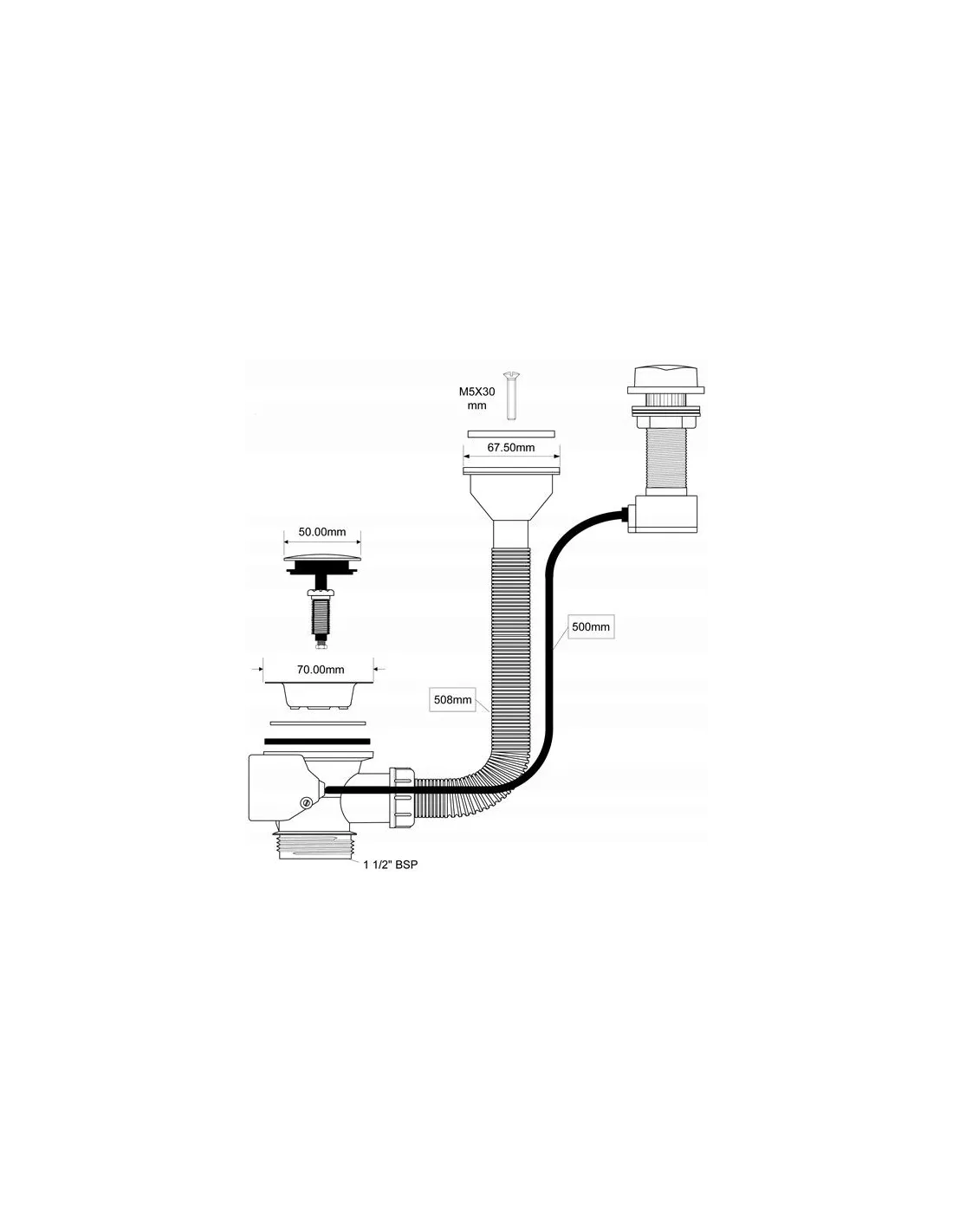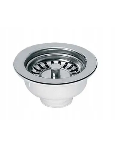 Spust zlewozmywakowy 1.1/2?x70mm z sitem ze stali nierdzewnej i korkiem automatycznym. Przelew z horyzontalnym podłączeniem do ociekacza.