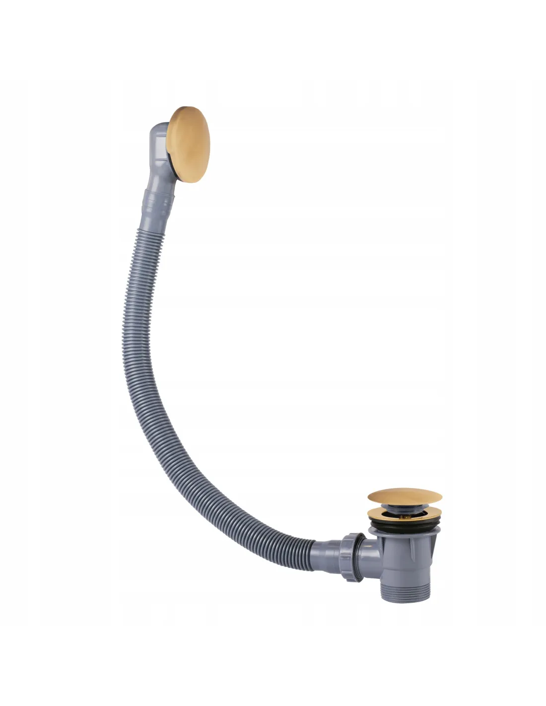 Syfon wannowy z przelewem i korkiem w kolorze złotym matowym od marki Tres. Średnica pokryw odpływu wynosi 7,2 cm. Syfon z systemem click-clack.