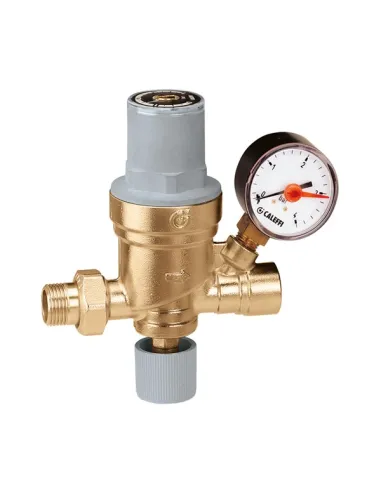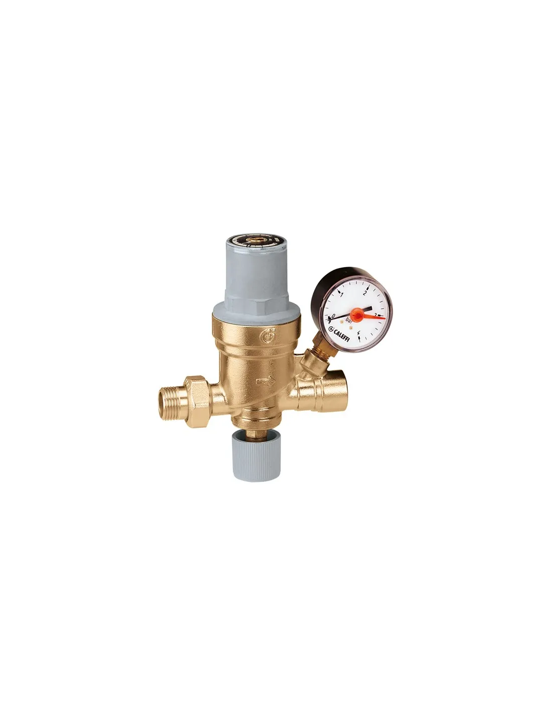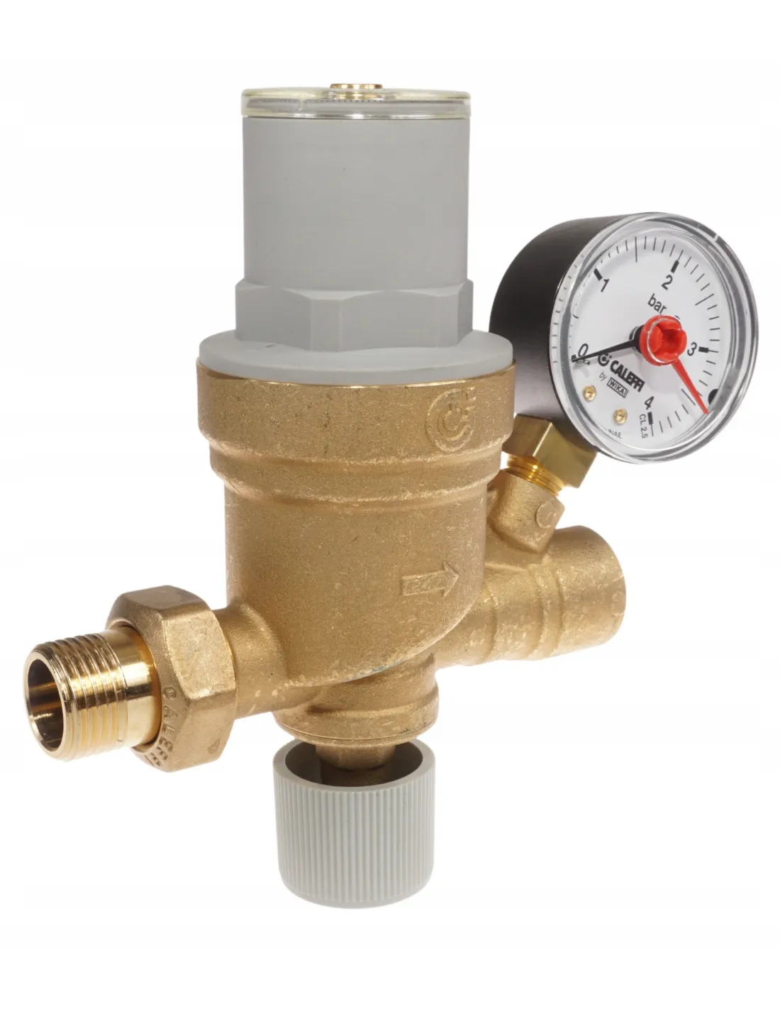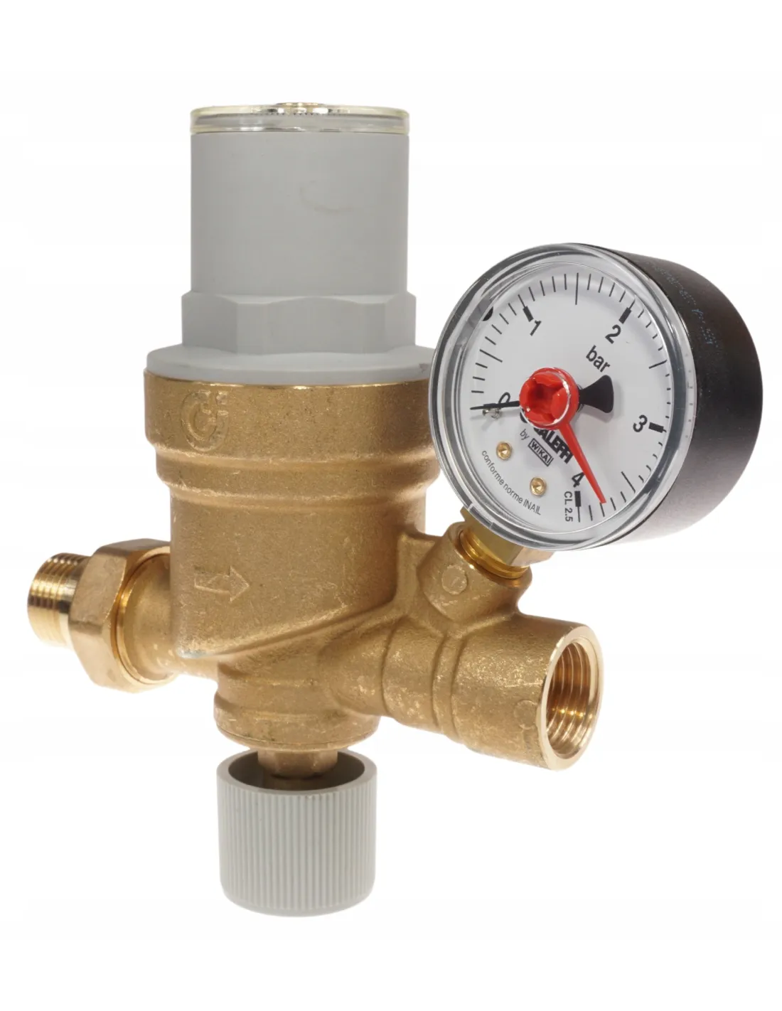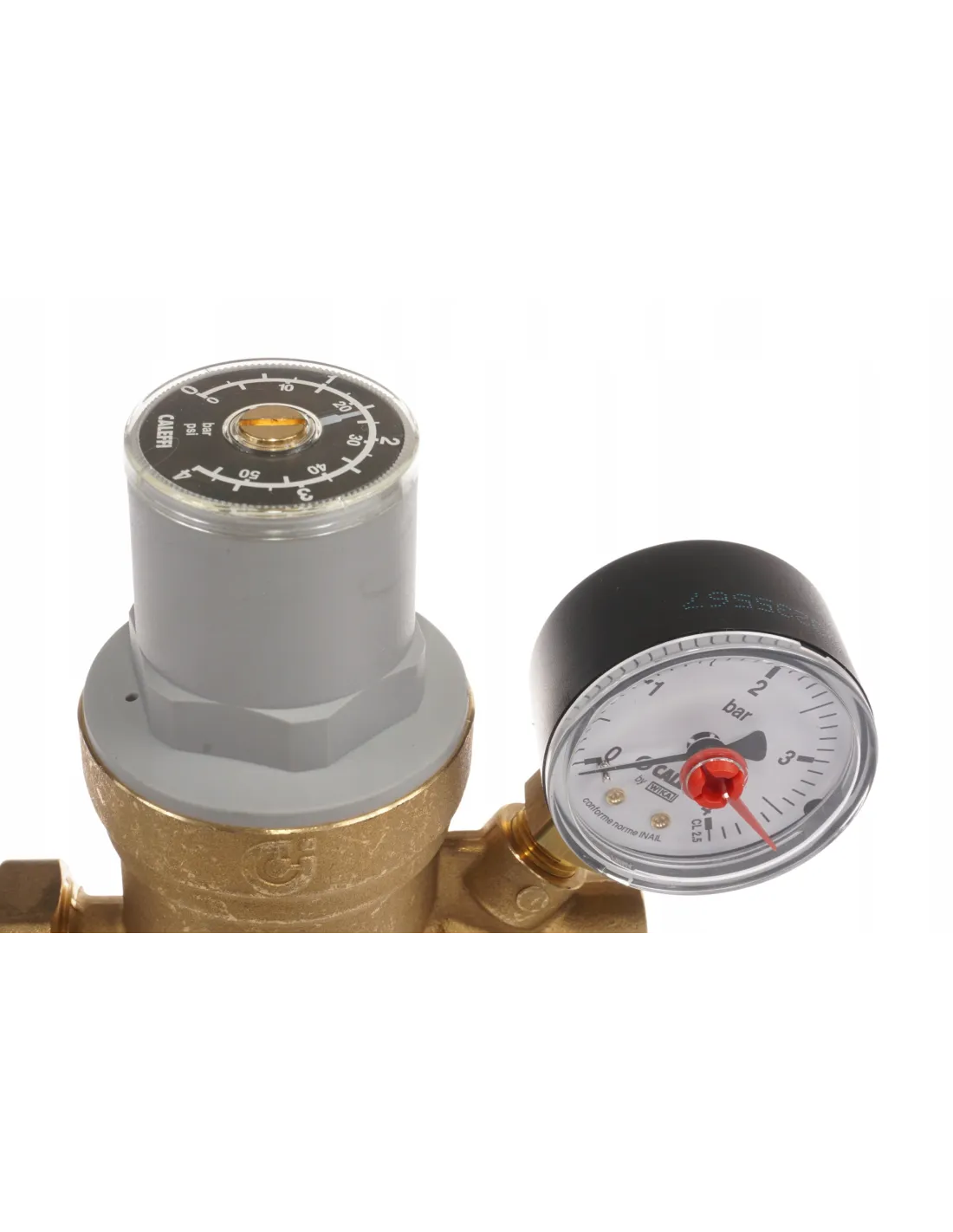 Przyłącza gwintowane 1/2\ GZ z złączką 1/2\ GW. Korpus oraz elementy wewnętrzne ruchome wykonane z mosiądzu. Powierzchnie ślizgowe z plastiku. Membrana i uszczelnienia z NBR. Usuwalny kartridż na czas konserwacji. Maksymalna temperatura pracy 65°C. Maksymalne ciśnienie zasilania 16 bar. Zakres nastawy 0,2÷4 bar. Wskaźnik nastawionego ciśnienia, dokładność ±0,15 bar. W komplecie z manometrem o zakresie 0÷4 bar, zawór odcinający, filtr, zawór zwrotny.