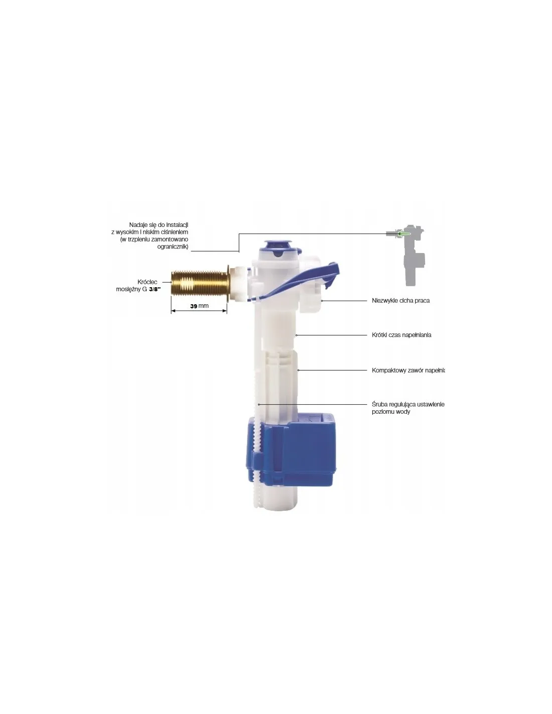 Dzięki dużej precyzji zawór pozwala na zużycie optymalnej ilości wody podczas spłukiwaniu toalety. Wytrzymałe komponenty zapewniają długą żywotność, a wąski profil doskonale pasuje do kompaktowych spłuczek bez konieczności regulacji.