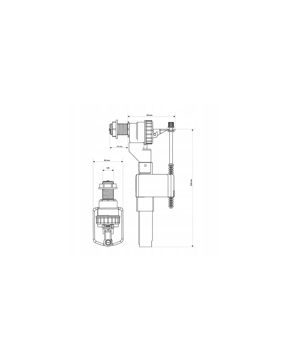 Przeznaczony do zainstalowania w zbiornikach spłukujących z otworem do montażu zaworu w bocznej ściance. Płynna regulacja poziomu napełnienia.