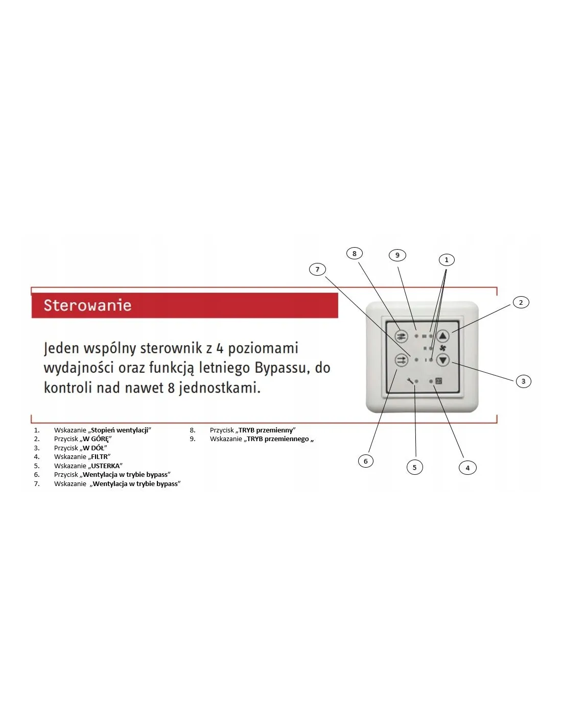 - Zestaw sterujący składa się z modułu sterowania, zasilacza i panelu obsługowego służącego do sterowania urządzeniami wentylacyjnymi.