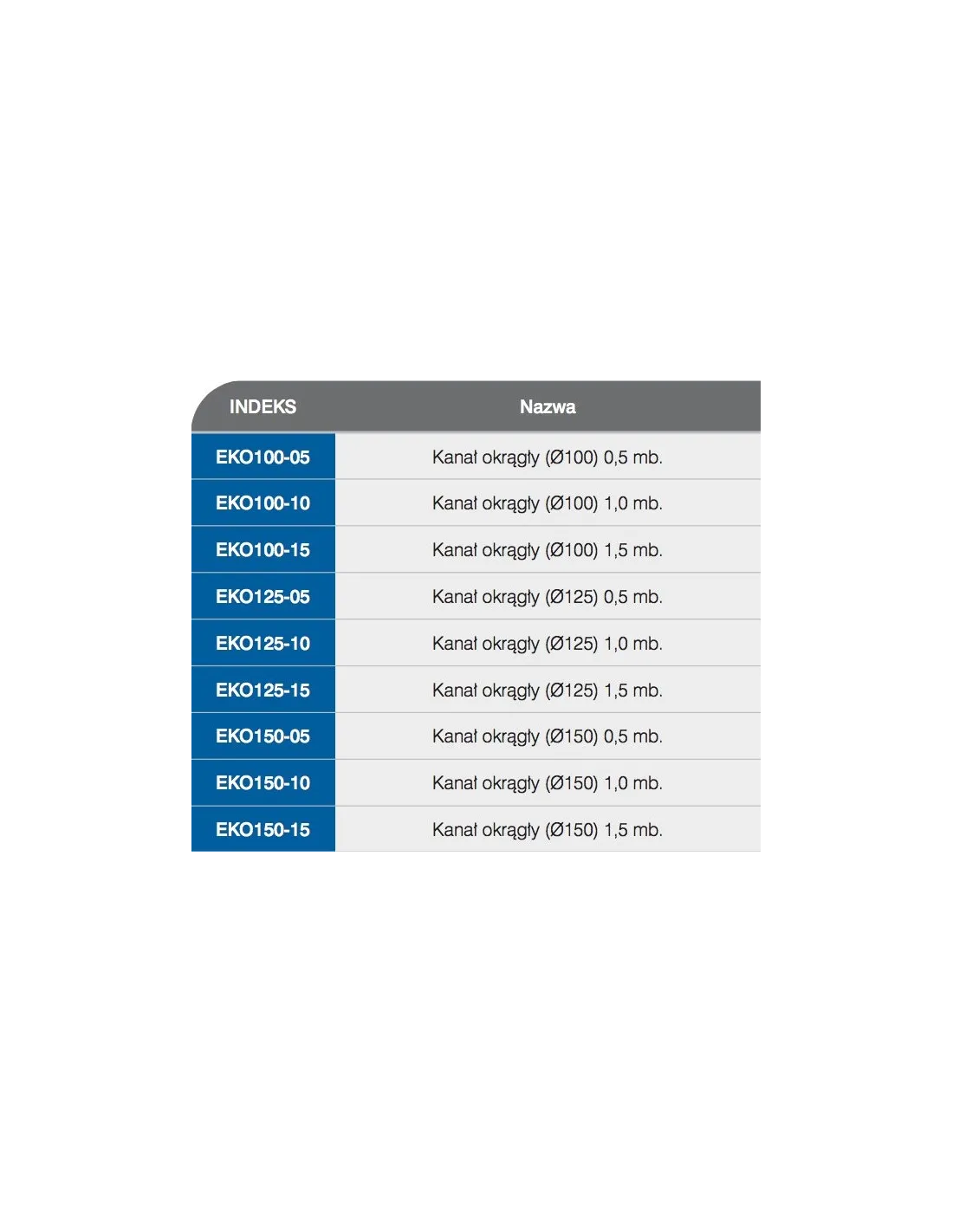 Są to trzy systemy okrągłe ?100, ?125, ?150 mm oraz cztery systemy płaskie, o wymiarach 55 mm x 110 mm, 60 mm x 120 mm, 75 mm x 150 mm i 60 mm x 204 mm.