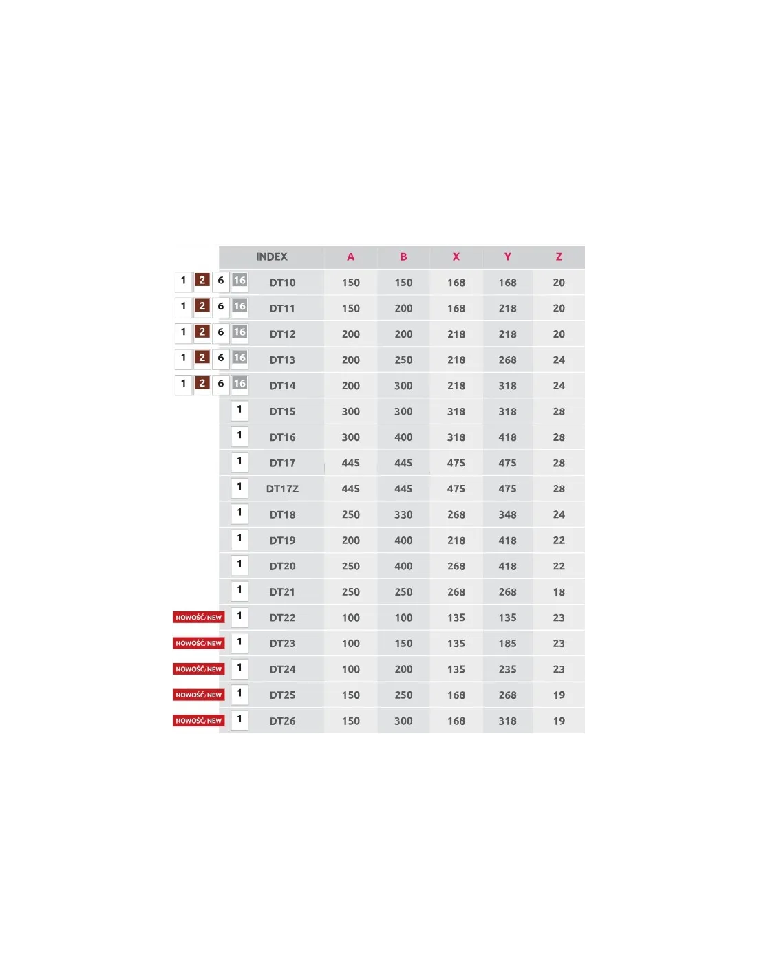 Seria DT produkowana jest w kilkunastu rozmiarach, począwszy od 100 x 100 mm do 450 x 450 mm, z opcją zamontowania zamka z kluczykiem. Mniejsze rozmiary od 150 x 150 mm do 200 x 300 mm występują w kilku odmianach kolorystycznych: białym, brązowym, srebrnym i w kolorze srebrnej satyny. Powierzchnię drzwiczek srebrzonych stanowi folia dekoracyjna.