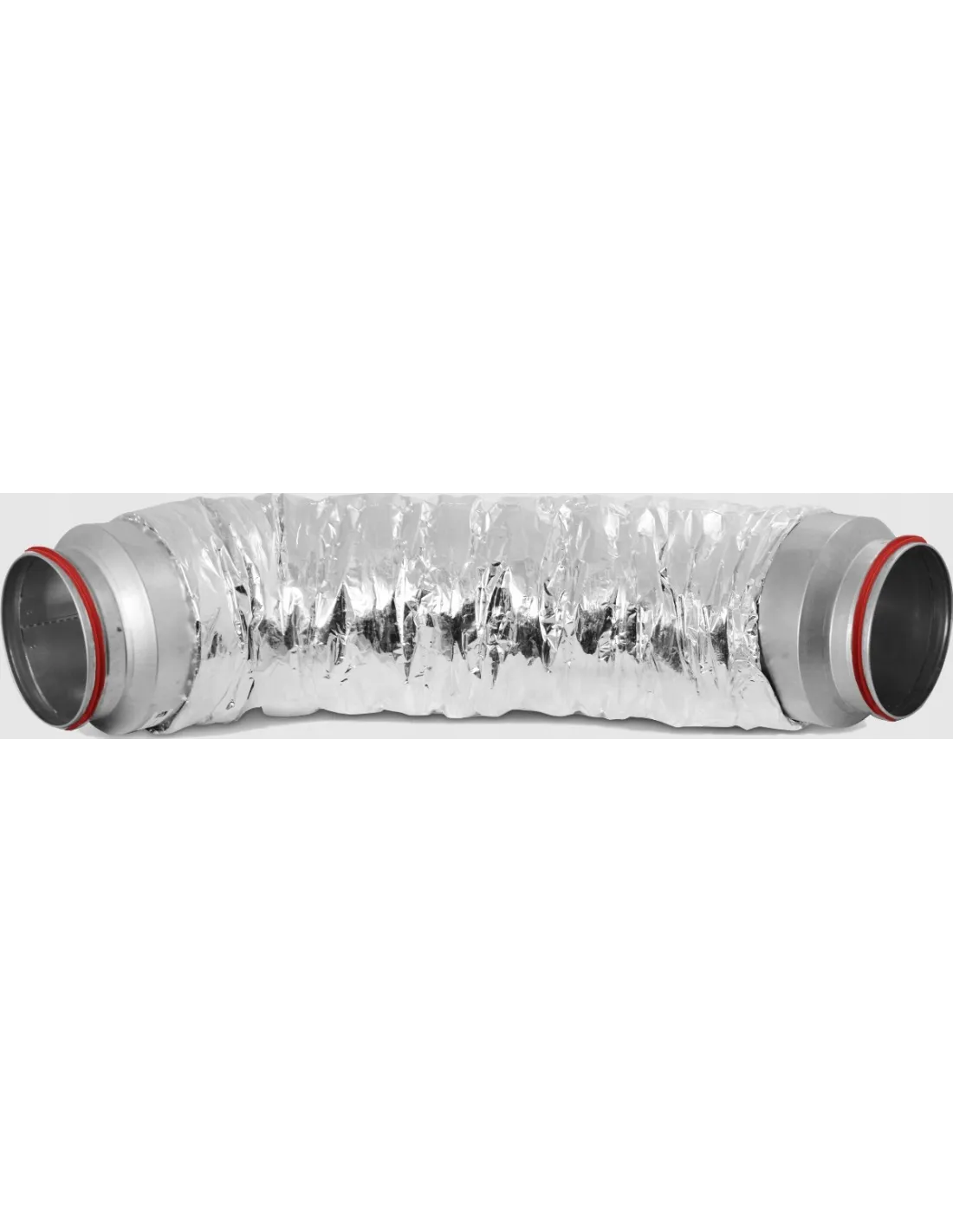 Elastyczny tłumik akustyczny przeznaczony do montażu na króćcach rekuperatora w celu skutecznego ograniczenia hałasu. We wnętrzu tłumika znajduje się przewód perforowany i warstwa izolacji o grubości 25 mm z wełny szklanej, całość jest okryta płaszczem aluminiowo-poliestrowym.