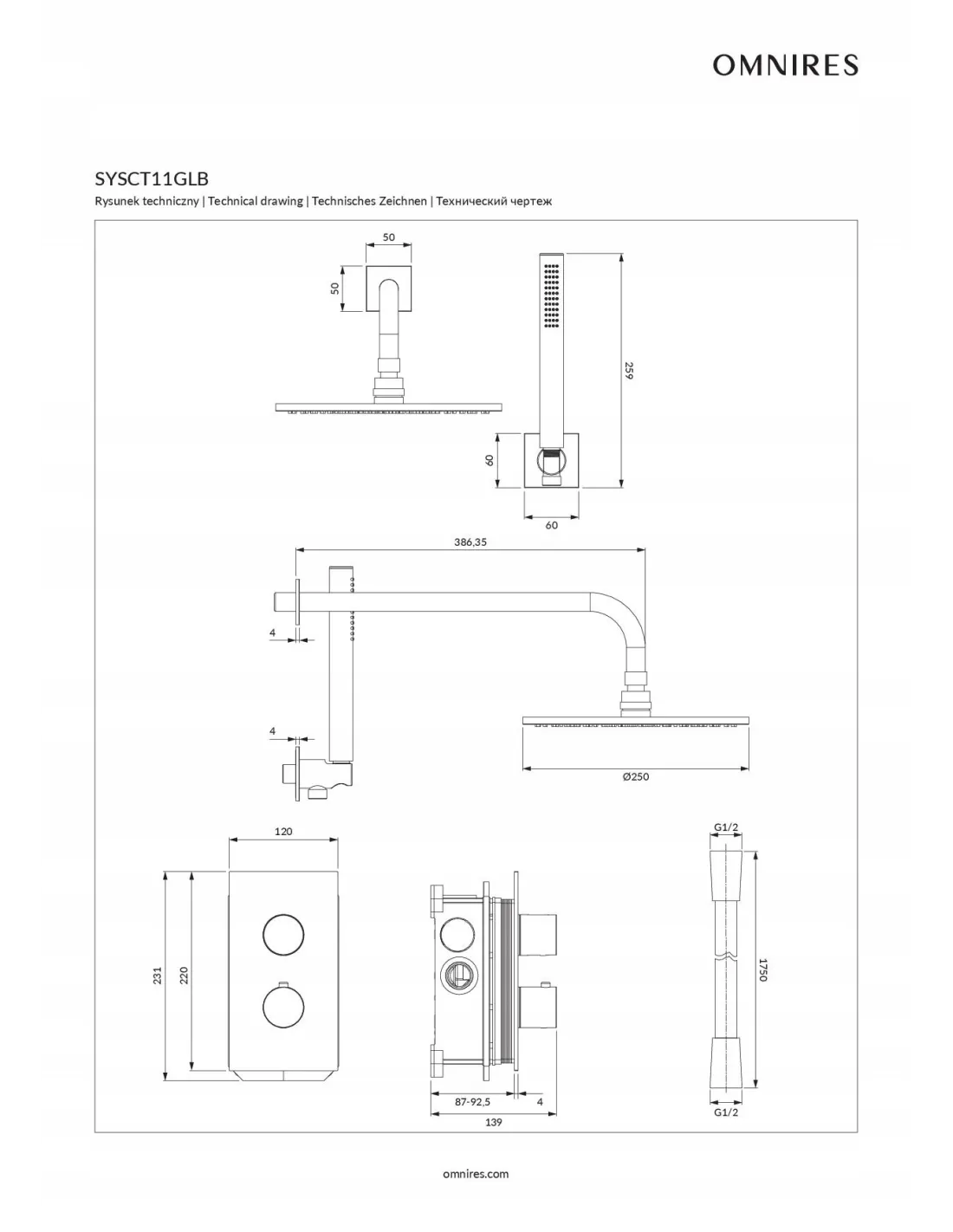 Termostatyczny system prysznicowy podtynkowy Omnires Contour SYSCT11GLB