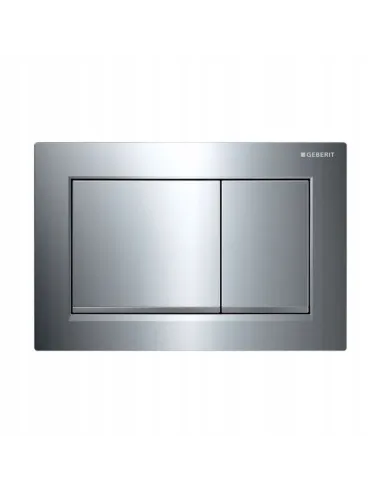 Oferowany przycisk Geberit Omega30 wykonany jest w kolorze chromu matowego jednakże dolna część przycisku jest ciekawie wykończona paskiem w kolorze chromu błyszczącego.