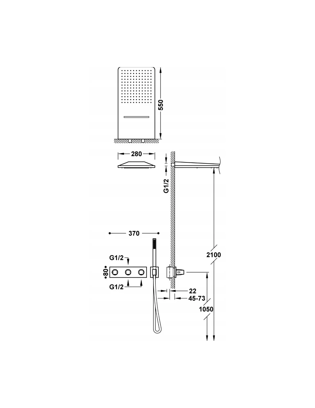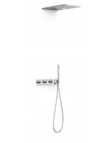 · W zestawie korpus podtynkowy termostatyczny o instalacji poziomej.· Regulator natężenia przepływu i rozgałęźnik 3-drożny.· Pokrętło kwadratowo-okrągłe.· Deszczownica naścienna ze stali nierdzewnej z 2 rodzajami strumienia (deszcz/kaskada). 280x550 mm. WAŻNE:Zamontować spust &gt