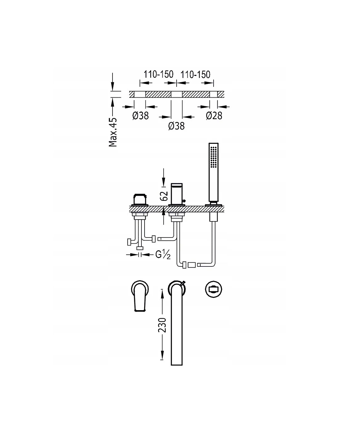 Trzyotworową baterię 211.161.03 firmy Tres-Project można zamontować zarówno na krawędzi wanny, jak i na jej obudowie. Komplet składa się ze stałej wylewki o długości 230 mm, tradycyjnego uchwytu do sterowania temperaturą wody oraz słuchawki natryskowej. Została ona wzbogacona o system antical zapobiegający osadzaniu się kamienia na dyszach paneli prysznicowych, co w konsekwencji wydłuża ich żywotność. Bateria umożliwia przepływ strumienia do 13 l/min z maksymalnym ciśnieniem 3 bar. Za montaż akcesorium odpowiada przyłącze G 1/2. Trzyotworowa bateria 211.161.03 marki Tres-Project odznacza się atrakcyjną prezencją i nienaganną stylistyką. Wybarwienie w kolorze chromowanym nie ogranicza potencjału modelu w uzupełnianiu różnorodnych elementów wyposażenia łazienki.