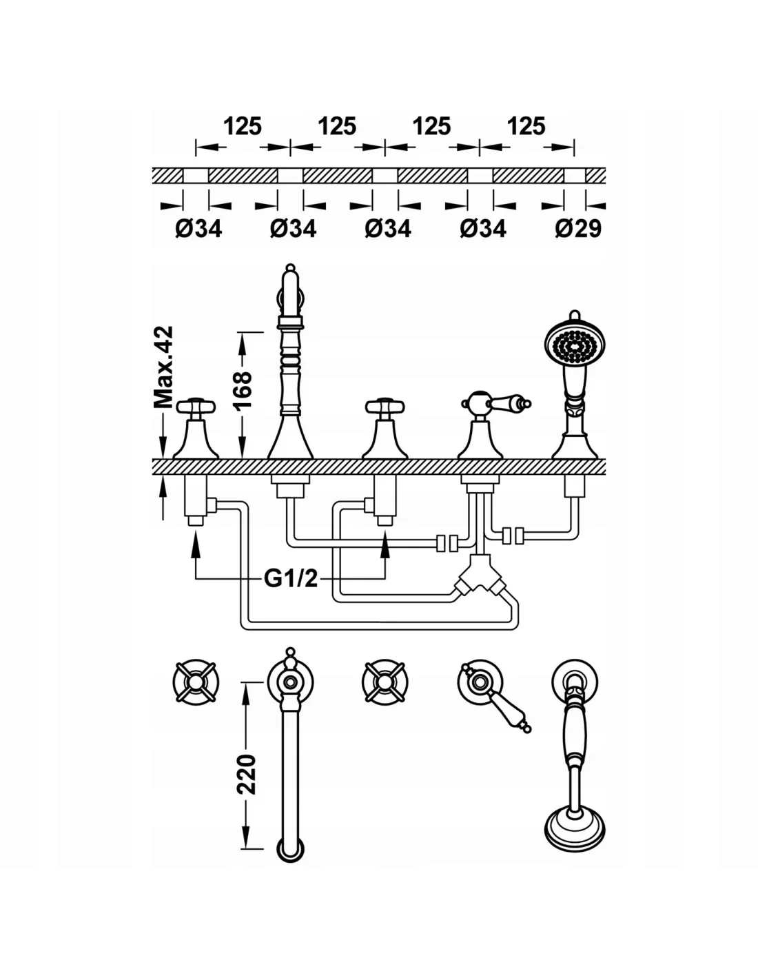 Regulacja pokrętłami, armatura wyposażona w przełącznik funkcji.· Słuchawka prysznicowa z mosiądzu systemem zapobiegającym osadzaniu się kamienia: ? 78 mm.· Natężenie przepływu: 3 bar - 12 l/m.