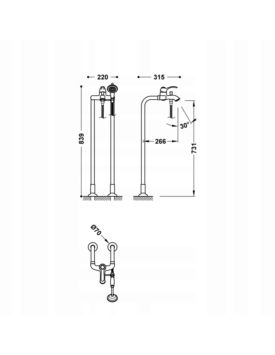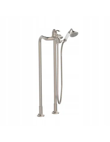 Z dwoma pionowymi przyłączmi podłogowymi do wody. Słuchawka prysznicowa z mosiądzu systemem zapobiegającym osadzaniu się kamienia: ? 78 mm. Stały chwyt do słuchawki prysznicowej. Wzmocniony wąż metalowy.