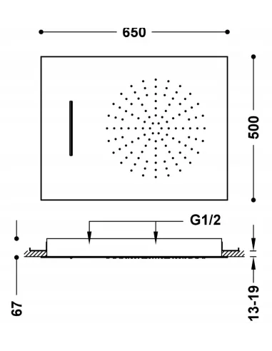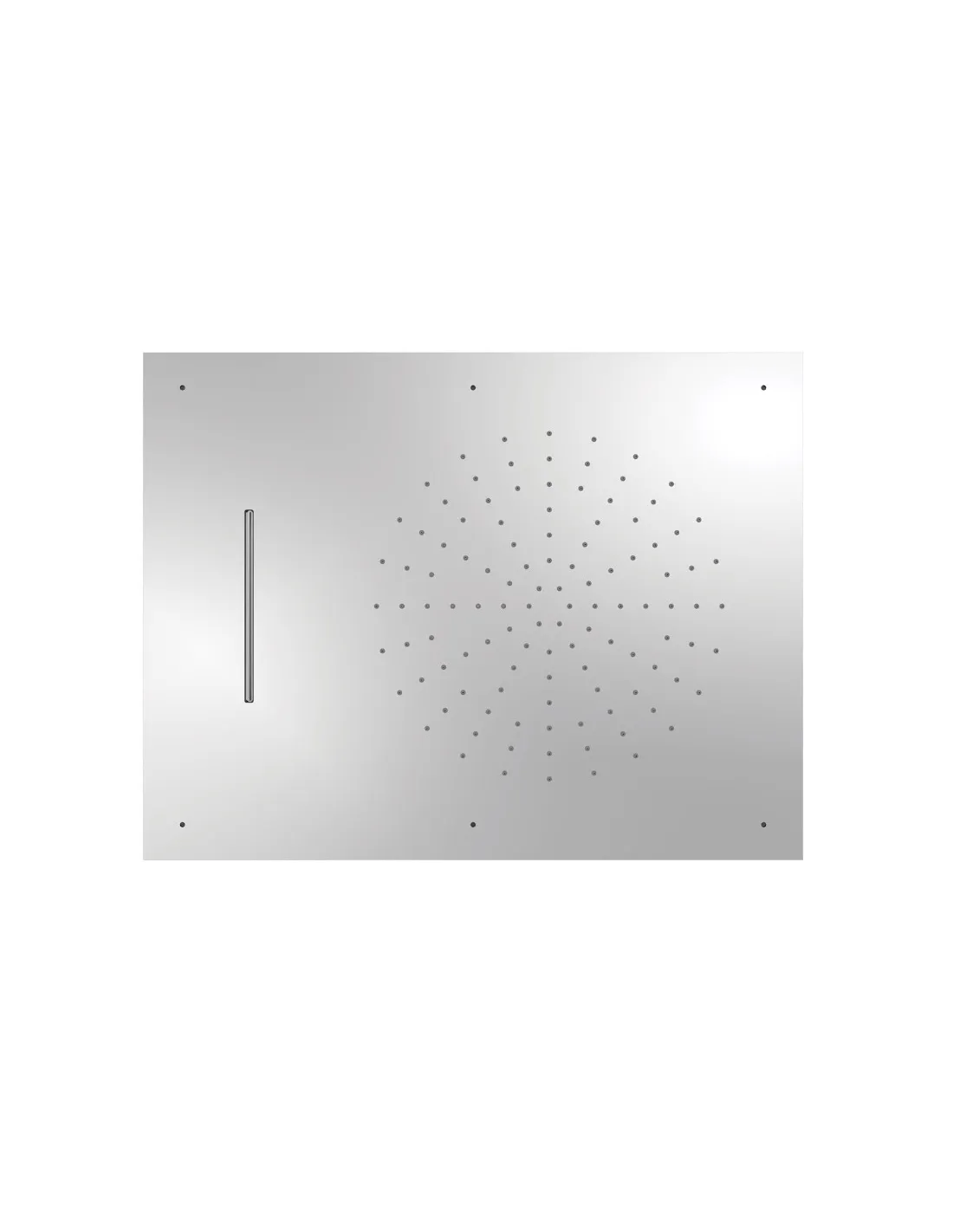 Z 2 rodzajami strumienia (deszcz/kaskada). Zasilanie wodą 2-drożne wody niezależne. Wymiary: 500x650 mm. Materiał: Stal nierdzewna.Dysze antyosadowe.