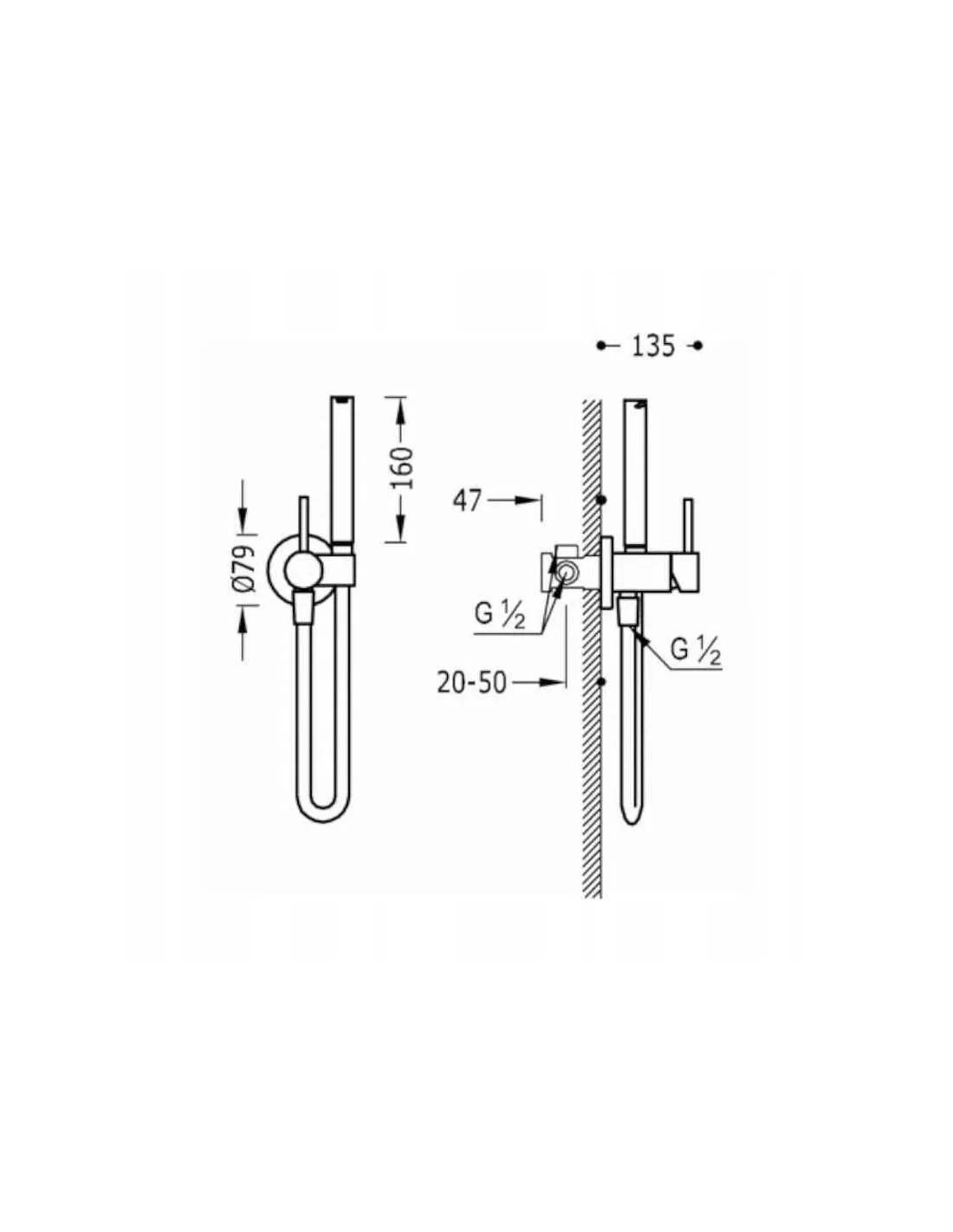 Opcja dla ścian z płyt gipsowo-kartonowych. Z wodą zimną lub ciepłą. Słuchawka prysznicowa ze złączem ograniczającym do 5 l/min. i system zabezpieczający przed kapaniem. Uchwyt stały do słuchawki prysznicowej montowany po prawej lub po lewej stronie. Satynowy wąż.