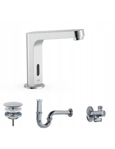 39210307 - Elektroniczna bateria 1-drożna umywalkowa.134215028 - Zawór spustowy zawsze otwarty do umywalki.134215024 - Wygięty syfon umywalkowy przegubowy.134215007 x 1 - Kurek kątowy z filtrem.