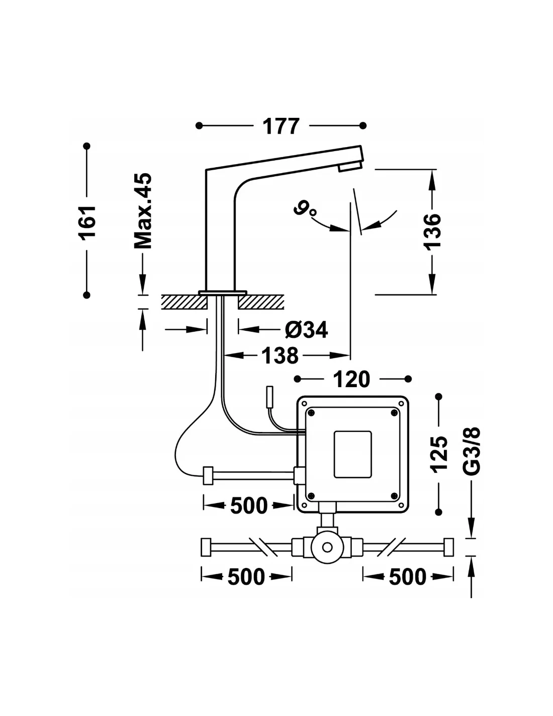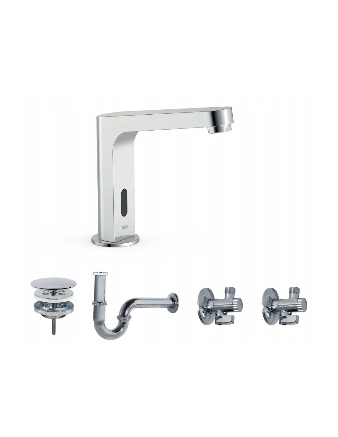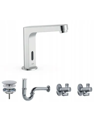 39210309 - Bateria elektroniczna umywalkowa z systemem mieszania wstępnego.134215028 - Zawór spustowy zawsze otwarty do umywalki.134215024 - Wygięty syfon umywalkowy przegubowy.134215007 x 2 - Kurek kątowy z filtrem.