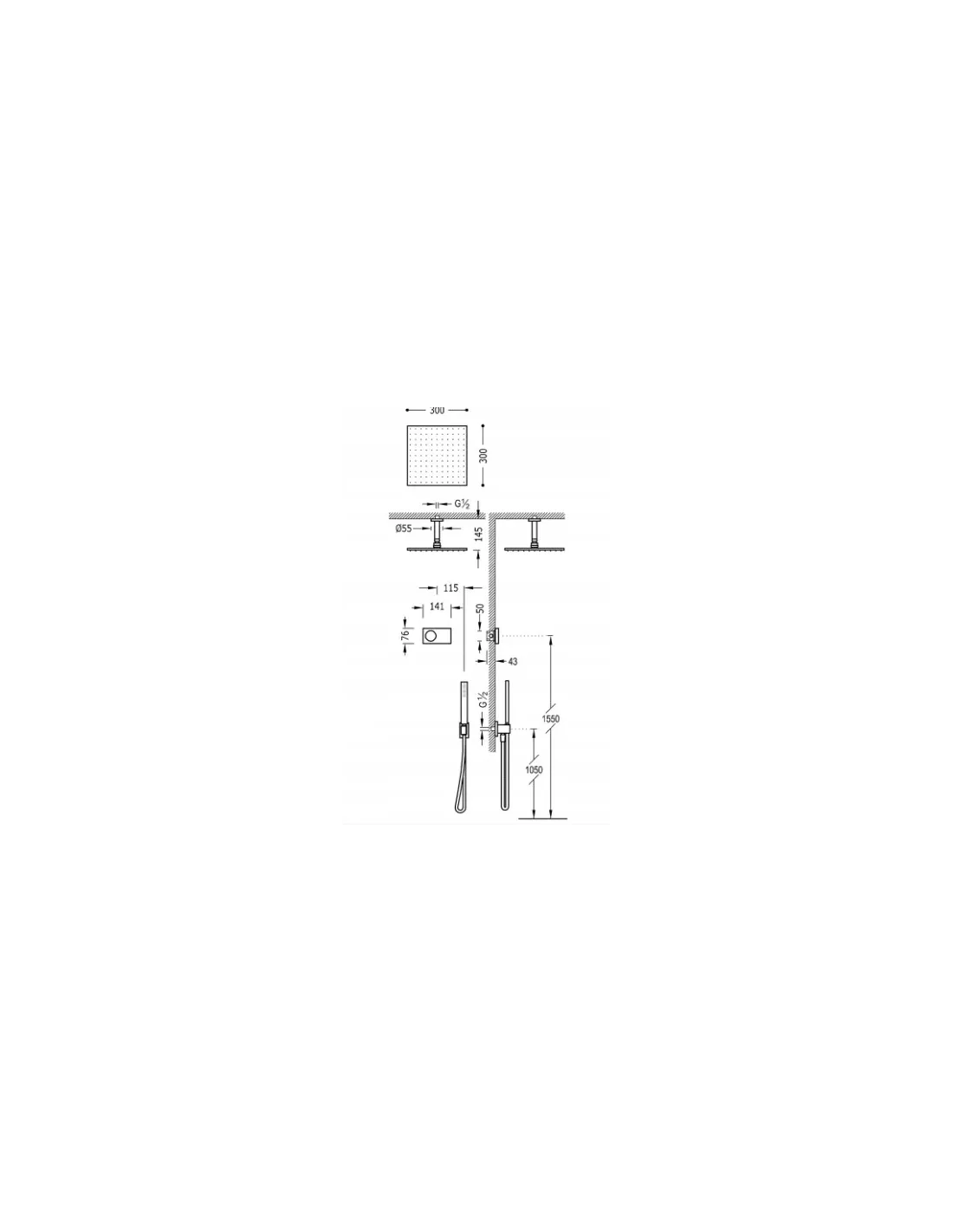 · Natrysk sufitowy ze stali nierdzewnej 300x300 mm. z kolankiem.
