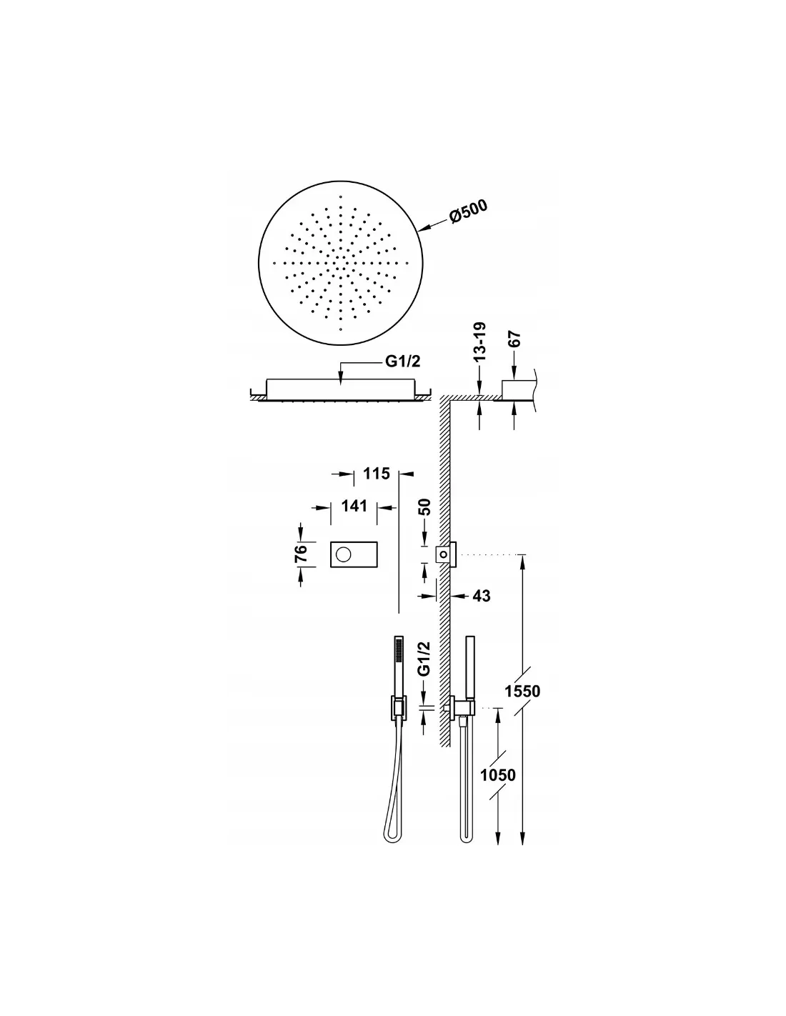 · W zestawie czarny elektroniczny sterownik z uszczelkami przeciwwilgociowymi firmy Schlüter.· W zestawie elektroniczna centralka termostatyczna (2-drożna).· Deszczownica podtynkowa sufitowa ze stali nierdzewnej: ? 500 mm.· Uchwyt do słuchawki prysznicowej z przyłączem w ścianie.· Słuchawka prysznicowa z mosiądzu z systemem zapobiegającym osadzaniu się kamienia.· Satynowy wąż.