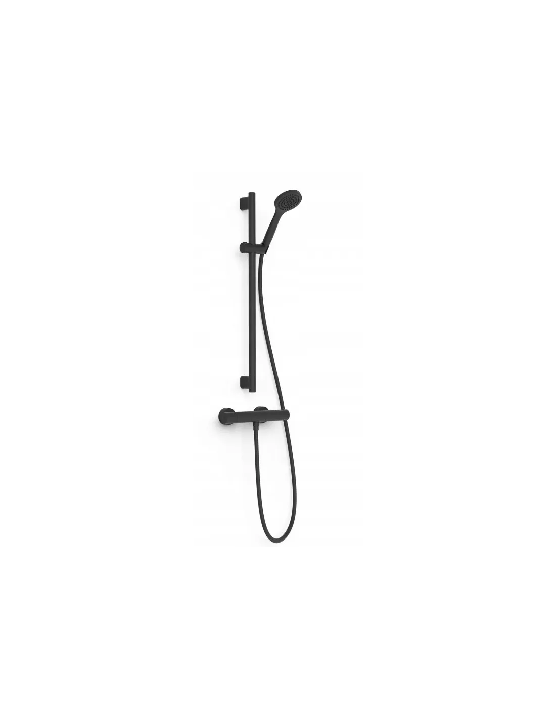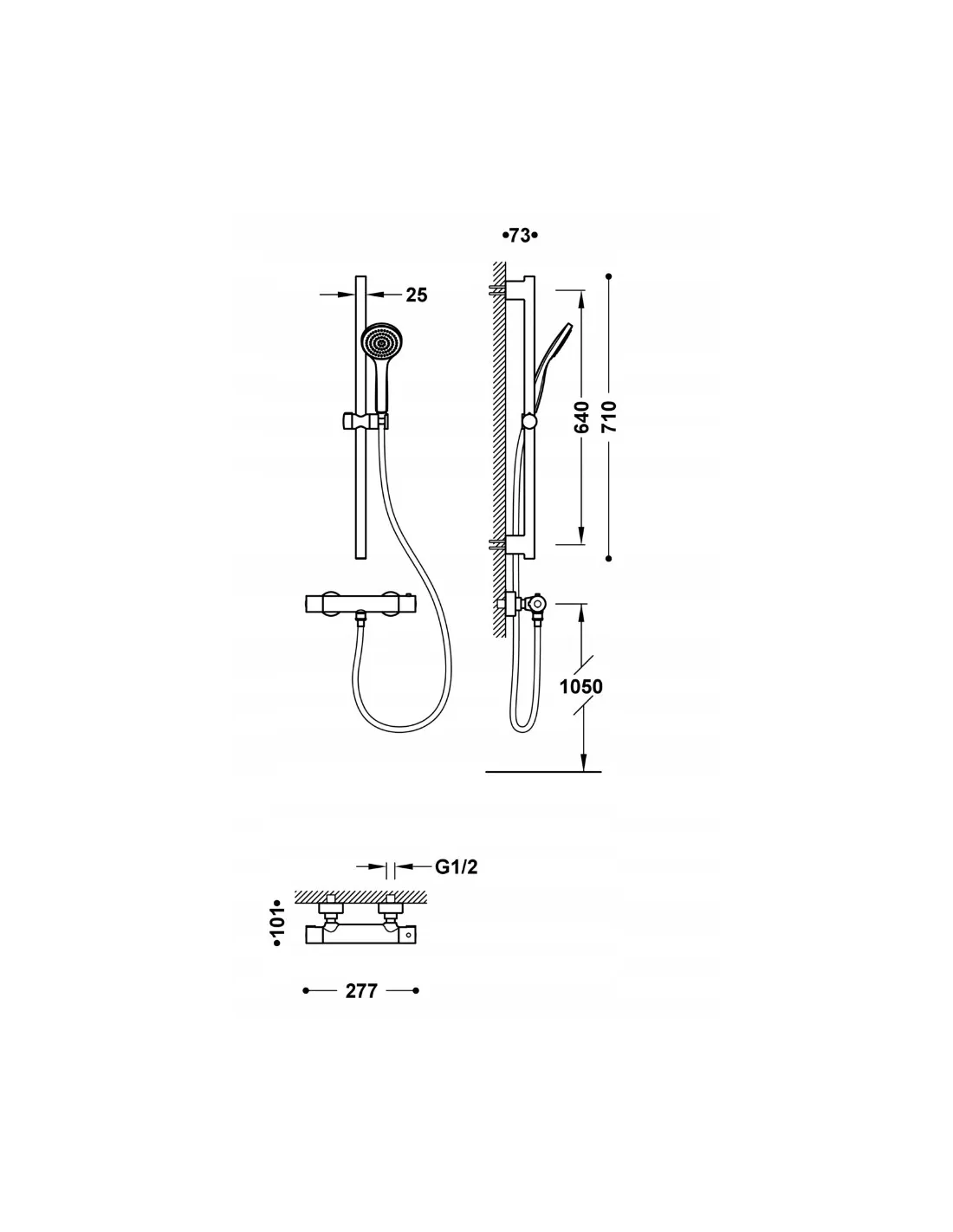 · Drążek prysznicowy: dł. 640 mm.· Obrotowy i przesuwny uchwyt do słuchawki prysznicowej.· Słuchawka prysznicowa z systemem zapobiegającym osadzaniu się kamienia: ? 100 mm.· Satynowy wąż.