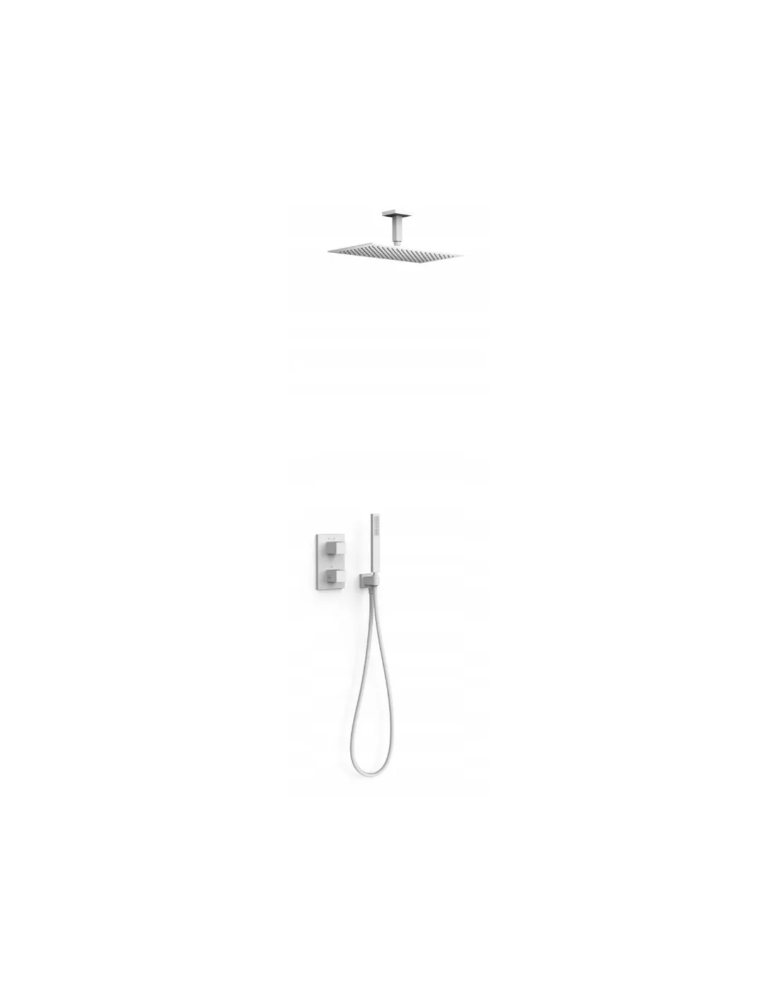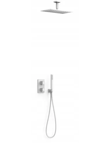 · Korpus podtynkowy w zestawie.· Pokrętło kwadratowe ze sterowaniem temperaturą. Dystrybutor ceramiczny 2-drożny.· Ramię sufitowez obrotową deszczownicą ze stali nierdzewnej: 400x250 mm.· Uchwyt do słuchawki prysznicowej z przyłączem w ścianie.· Słuchawka prysznicowa z mosiądzu z systemem zapobiegającym osadzaniu się kamienia.· Satynowy wąż.
