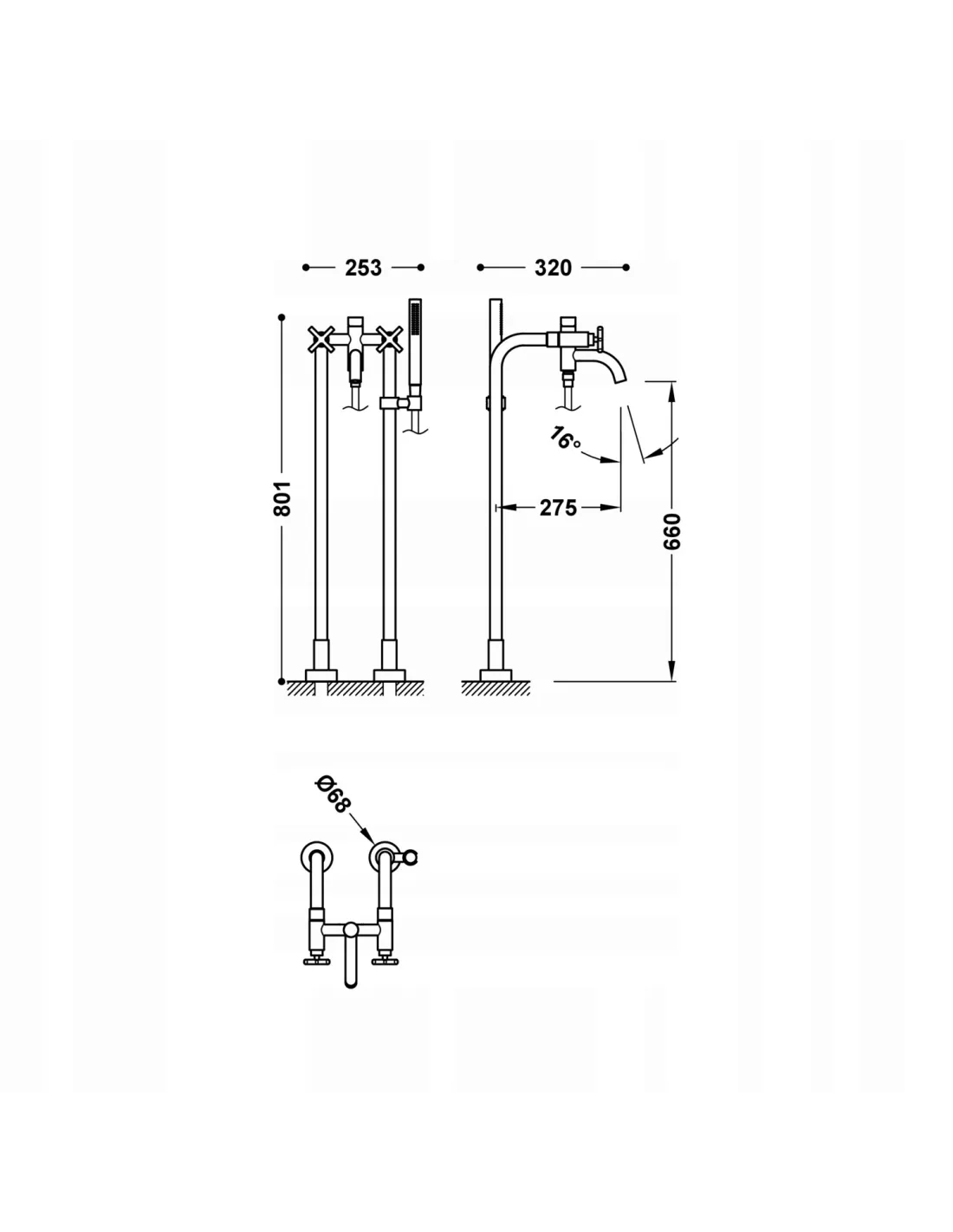 Z dwoma pionowymi przyłączmi podłogowymi do wody. Słuchawka prysznicowa z mosiądzu systemem zapobiegającym osadzaniu się kamienia. Uchwyt stały do słuchawki . Satynowy wąż.