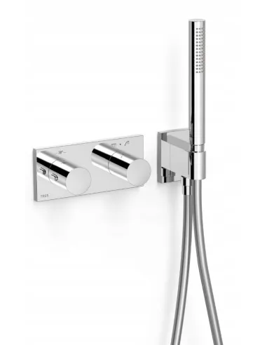 · W zestawie korpus podtynkowy termostatyczny o instalacji poziomej.· Regulator natężenia przepływu i rozgałęźnik 2-drożny.· Pokrętło okrągłe.· Uchwyt do słuchawki prysznicowej z przyłączem w ścianie.· Prysznic ruchomy z mosiądzu z systemem zapobiegającym osadzaniu się kamienia.· Satynowy wąż.