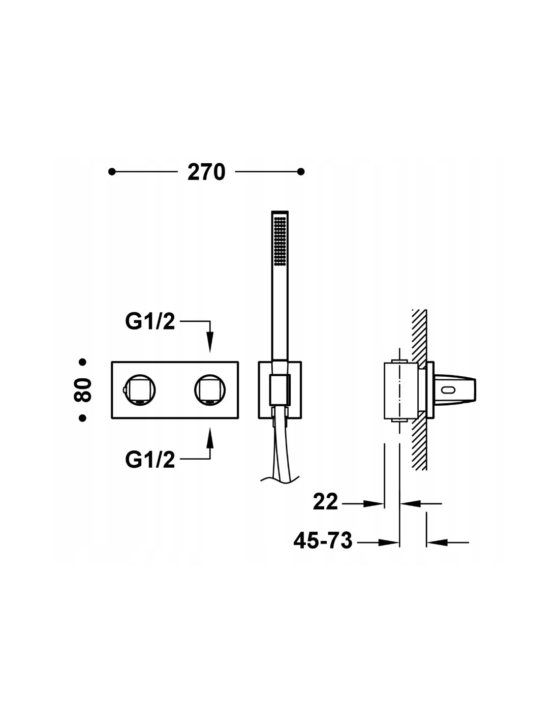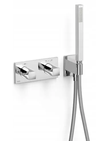 · W zestawie korpus podtynkowy termostatyczny o instalacji poziomej.· Regulator natężenia przepływu i rozgałęźnik 2-drożny.· Pokrętło kwadratowo-okrągłe.· Uchwyt do słuchawki prysznicowej z przyłączem w ścianie.· Prysznic ruchomy z mosiądzu z systemem zapobiegającym osadzaniu się kamienia.· Satynowy wąż.