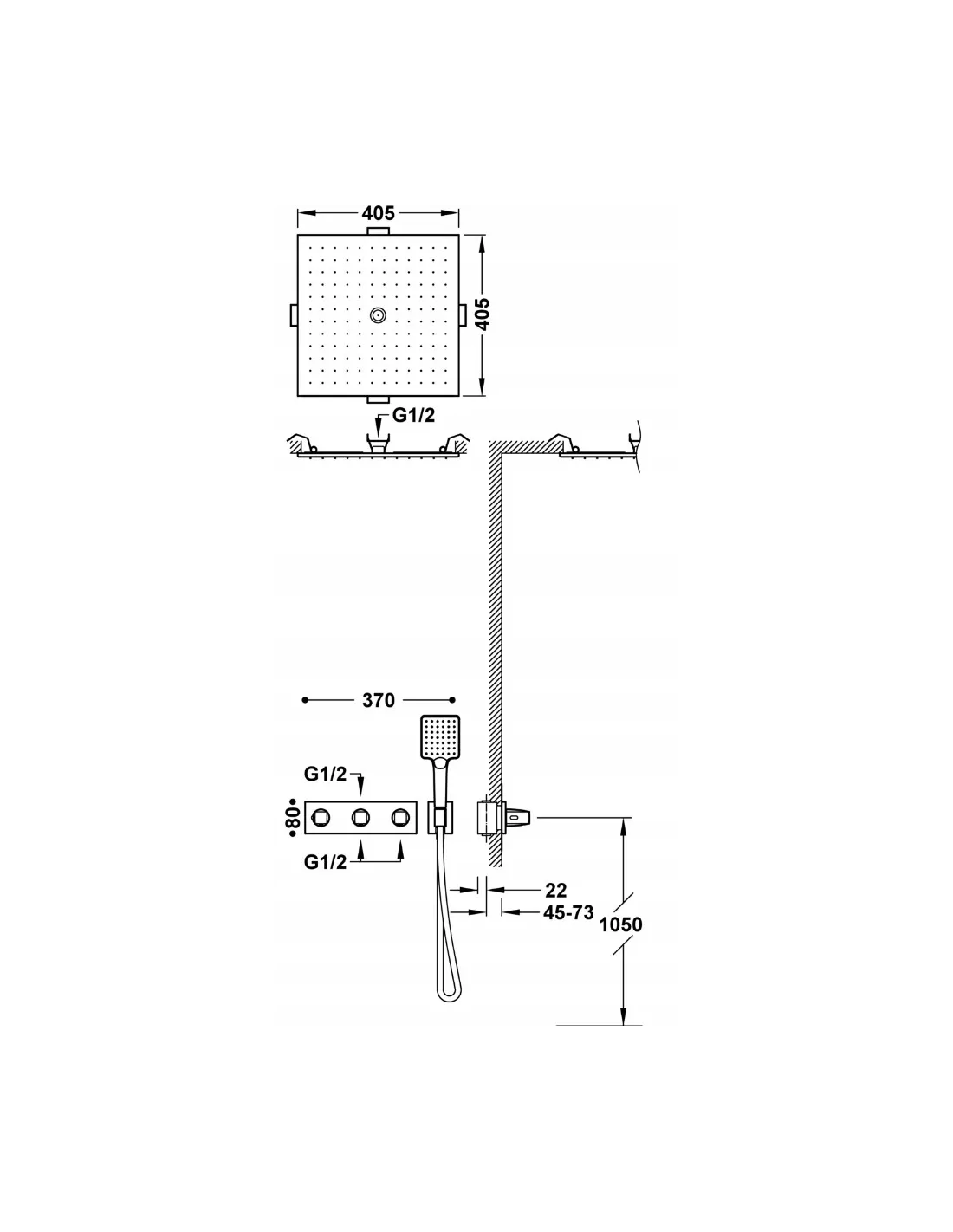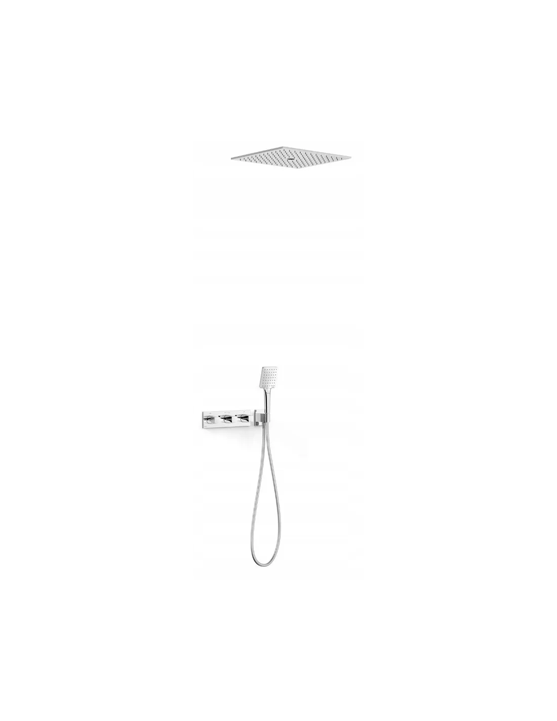 · W zestawie korpus podtynkowy termostatyczny o instalacji poziomej.· Regulator natężenia przepływu i rozgałęźnik 3-drożny.· Pokrętło kwadratowo-okrągłe.· Deszczownica sufitowa podtynkowa ze stali nierdzewnej z 2 rodzajami strumienia (deszcz/free flow). 405x405 mm.· Uchwyt do słuchawki prysznicowej z przyłączem w ścianie.· Słuchawka prysznicowa z systemem zapobiegającym osadzaniu się kamienia: 96x110 mm. (3 rodzaje strumienia).· Satynowy wąż.