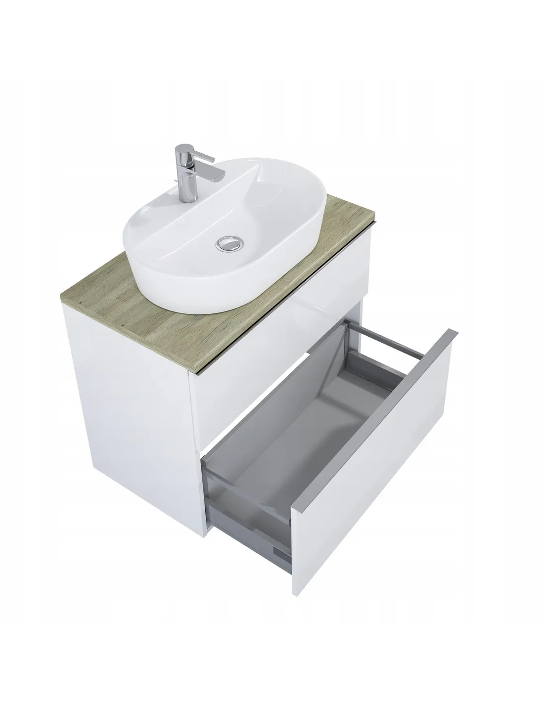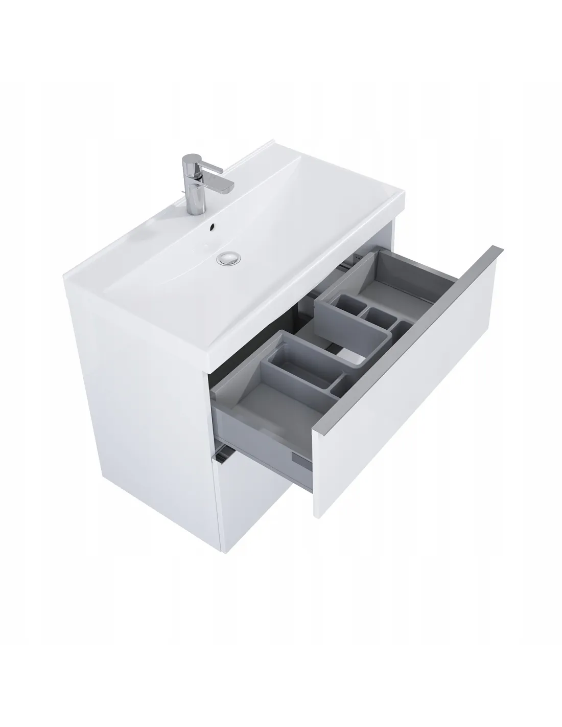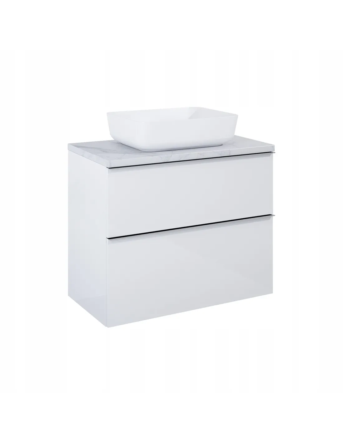 Szafka LOOK wykonana z materiałów wysokiej jakości. Front oraz korpus stworzony z płyty laminowanej w kolorze biały matt. Produkt o szerokości 800 mm, wyposażona w dwie szuflady z pełnym wysuwem oraz z funkcją cichego samodomyku. Wnętrze pierwszej szuflady zaopatrzone w organizer co pozwala na utrzymanie porządku wewnątrz.