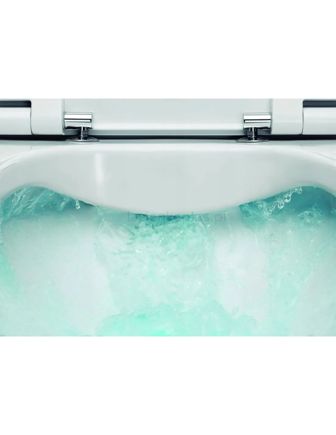 Bezkołnierzowa miska WC posiadają nowy system dystrybucji wody, który wprawia wodę w ruch z większą siłą i rozprowadza ją równomiernie po całej powierzchni, przekraczając standardy obowiązujące w UE.