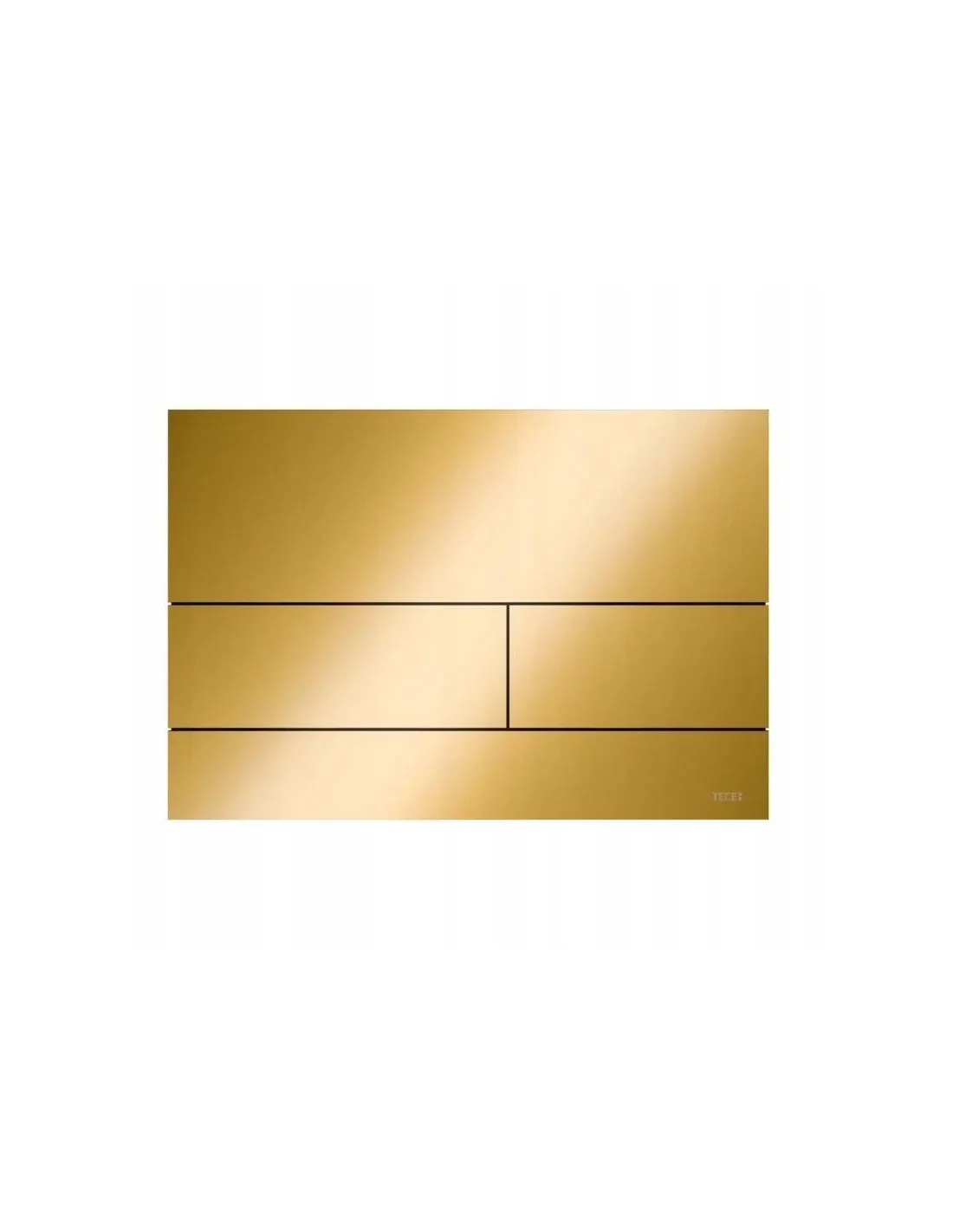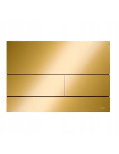 Przycisk spłukujący wykonany z metalu, w kolorze złotym optycznym połyskującym od marki Tece z serii Square II przeznaczony do WC. Wymiary produktu wynoszą 220 x 150 x 3 mm. Przycisk jest wykonany z metalu z powłoką PVD. Produkt kompatybilny z płytką maskującą z koszem na kostki czyszczące.