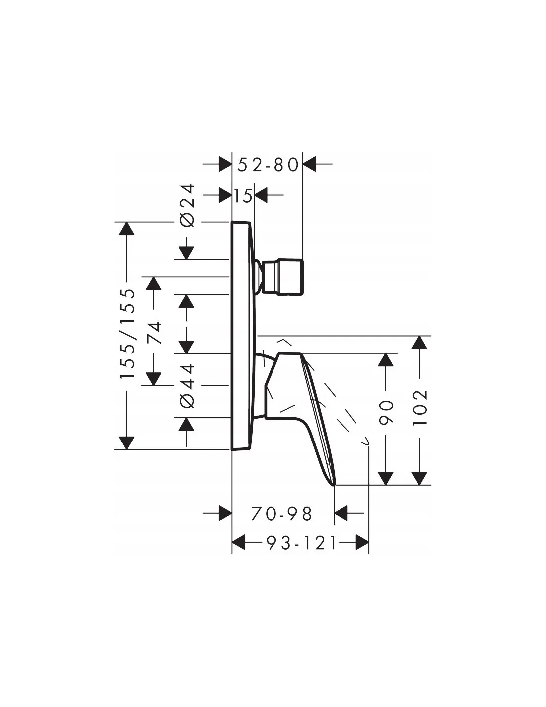 W zestawie znajduje się zewnętrzna część baterii: uchwyt z osłoną i przełącznikiem ciśnieniowym. Zestaw ten należy zamontować na module HansgroheiBox Universal umieszczanym w ścianie (kod producenta 01800180).