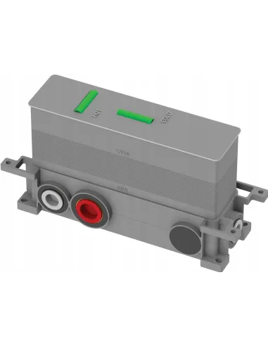Element podtynkowy 3-wyjściowy został wyposażony w mosiężny korpus, wysokiej jakości głowicę termostatyczną, przełączniki oraz zawory z filtrami. Jego zaletą jest łatwy montaż oraz minimalna głębokość zabudowy, która wynosi zaledwie 7cm.