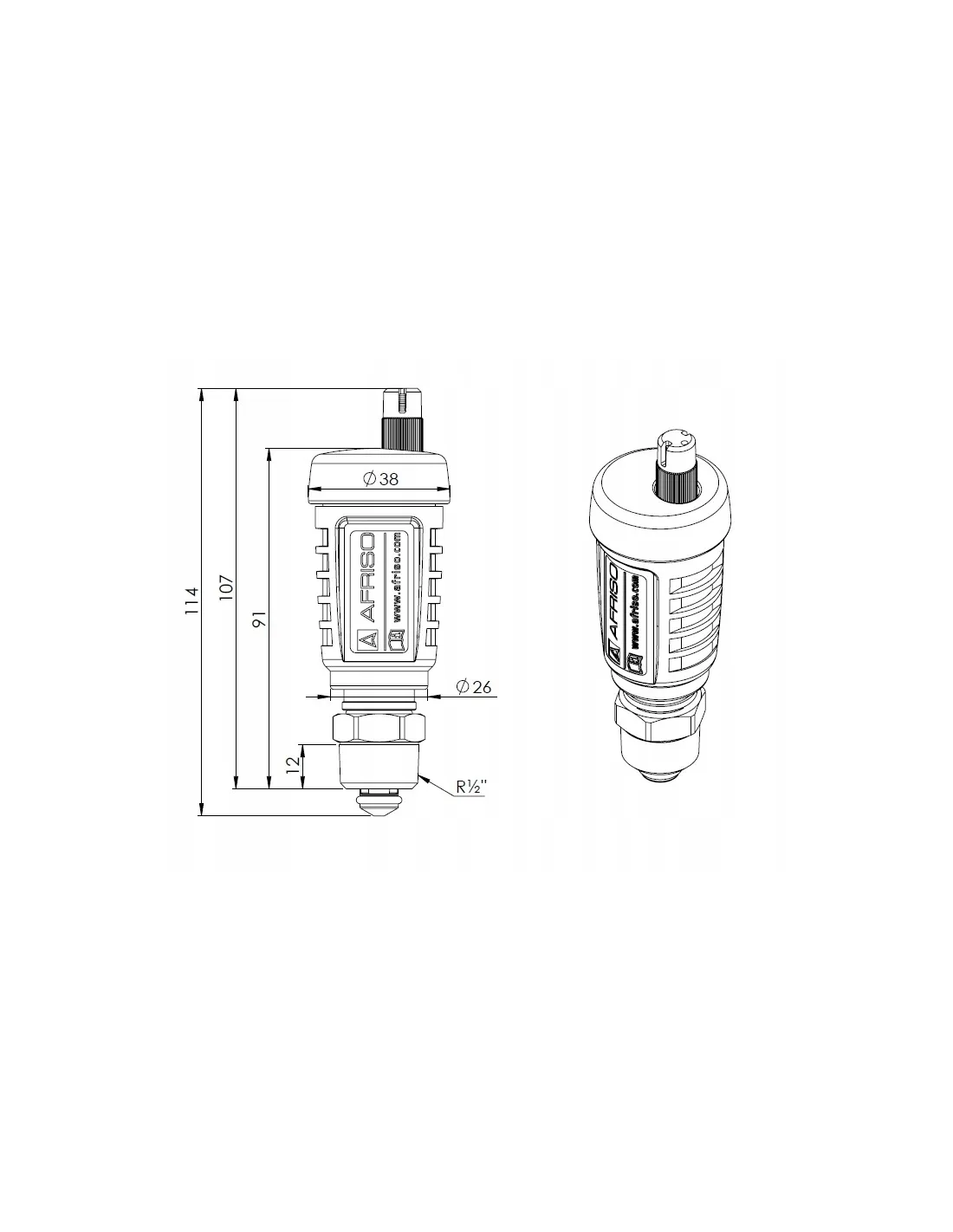 Odpowietrznik automatyczny pionowy, hybrydowy PrimoVent G3/8'' z Aquastop i zaworem stopowym, R1/2\ AFRISO