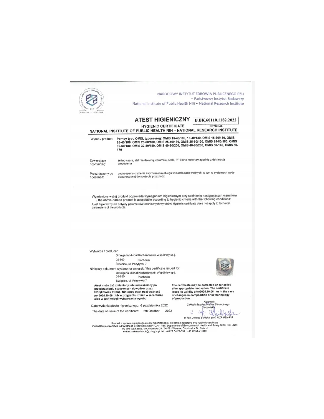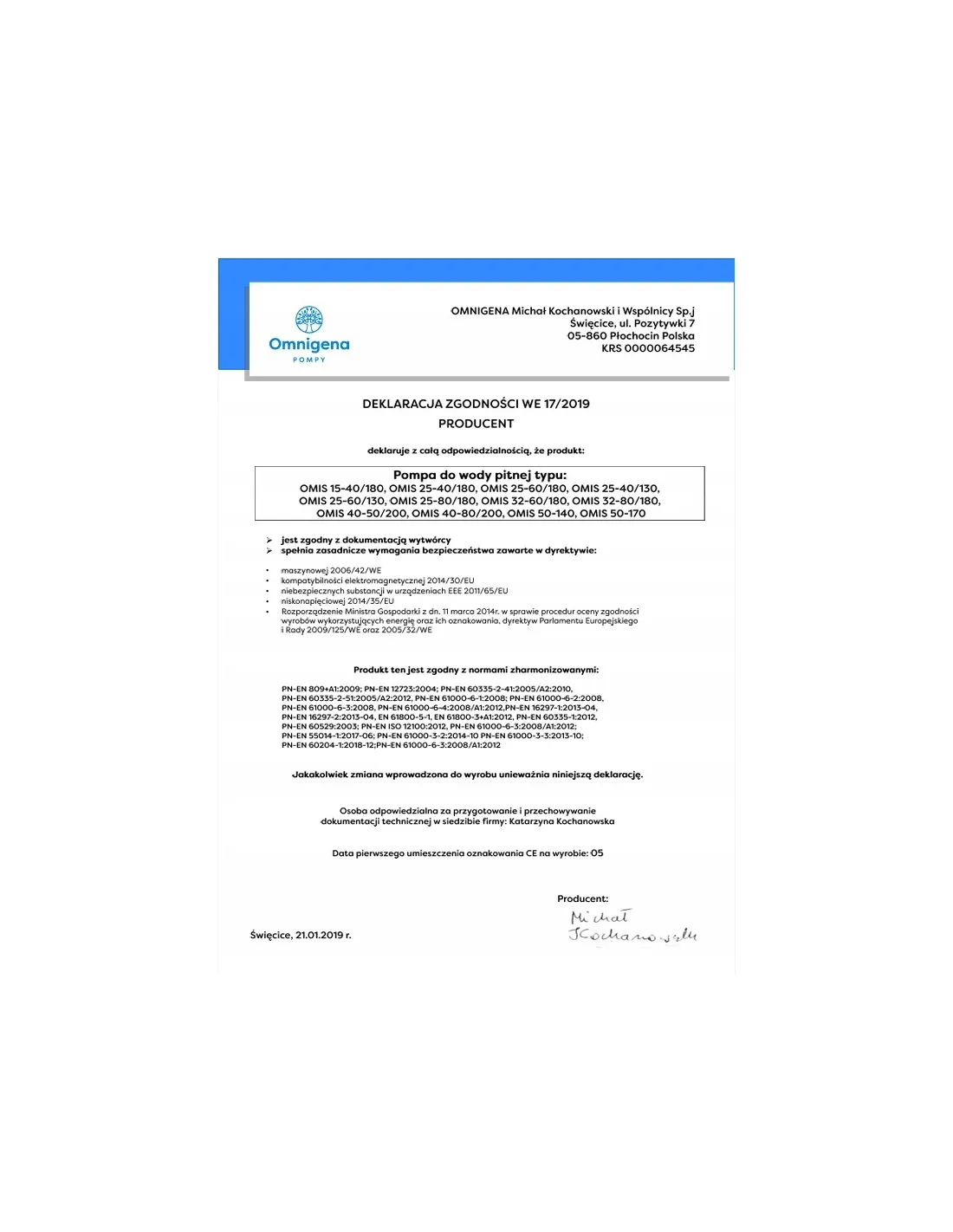 Pompy serii OMIS przeznaczone są pompowania wody pitnej, mogą pracować w obiegach wodnych, w których temperatura wody nie może przekraczać 120°C i nie może być niższa niż 5°C. Pompy nie mogą pracować w obiegach wodnych lub w obiegach zawierających wodę z glikolem w których mogą występować zanieczyszczenia stałe