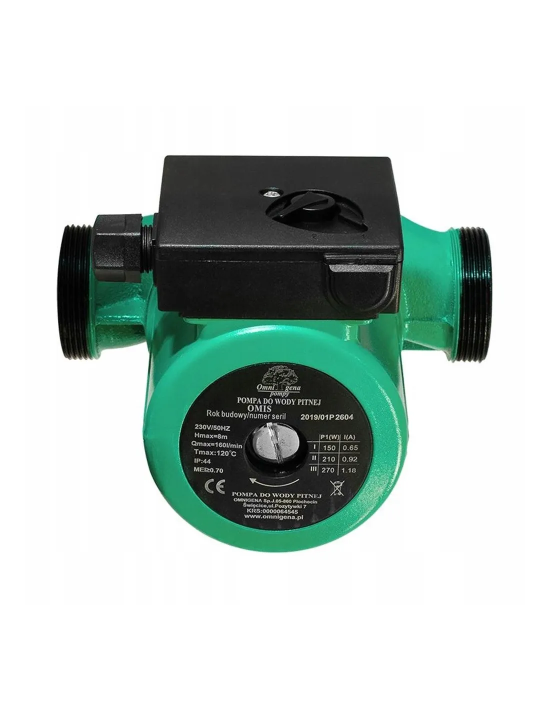 Urządzenie wyposażone jest w 3-biegowy silnik elektryczny o mocy odpowiednio 46/167/93 W. Pompa z rozstawem króćców przyłączeniowych 180 mm. Urządzenie jest przystosowane do pracy w obiegach wodnych lub obiegach zawierających wodę z glikolem w stosunku 50/50. Pompa współpracuje z cieczą o temperaturze w zakresie od 5°C do 120°C. Ten model dostarczany jest w zestawie ze śrubunkami. Zalecenia producenta: Pompa Omis nie może być wykorzystywana do obiegu wody zawierającej jakiekolwiek elementy stałe np.
