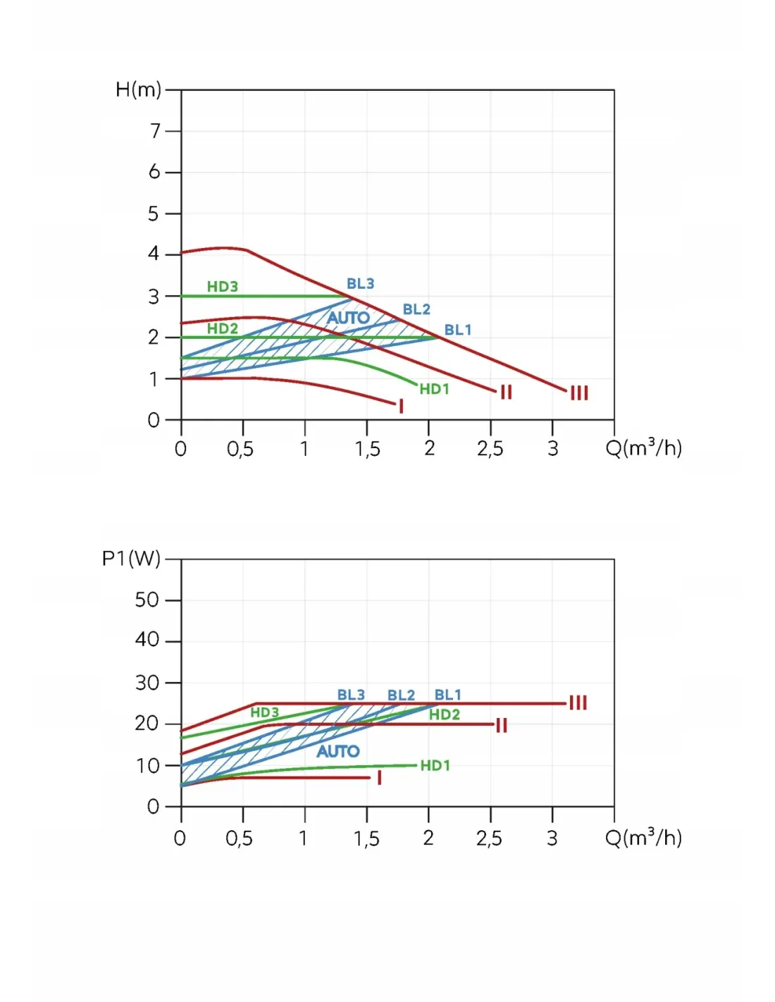 - Tryby pracy:AUTO, HS - krzywe stałej prędkości obrotowej, BL - krzywe ciśnienia proporcjonalnego, HD - krzywe stałego ciśnienia, PWM - Sterowanie zewnętrznym sygnałem wejściowym (modulacja szerokości impulsu)