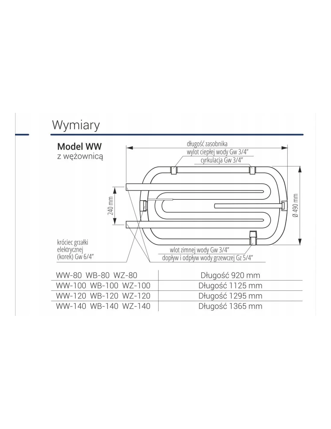 Poziome wymienniki c.w.u. model WW, z podwójną wężownicą oferowane są o pojemnościach 80, 100, 120 i 140, litrów. Przeznaczone są do ogrzewania i przechowywania ciepłej wody użytkowej. Doskonale sprawdzają się przy współpracy z wodnymi niskotemperaturowymi kotłami grzewczymi na paliwo stałe.