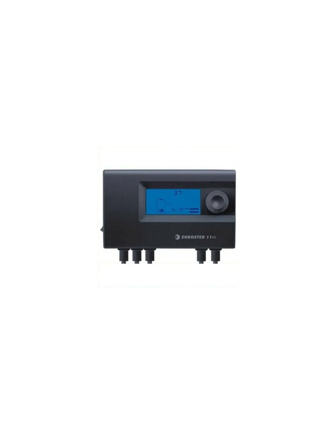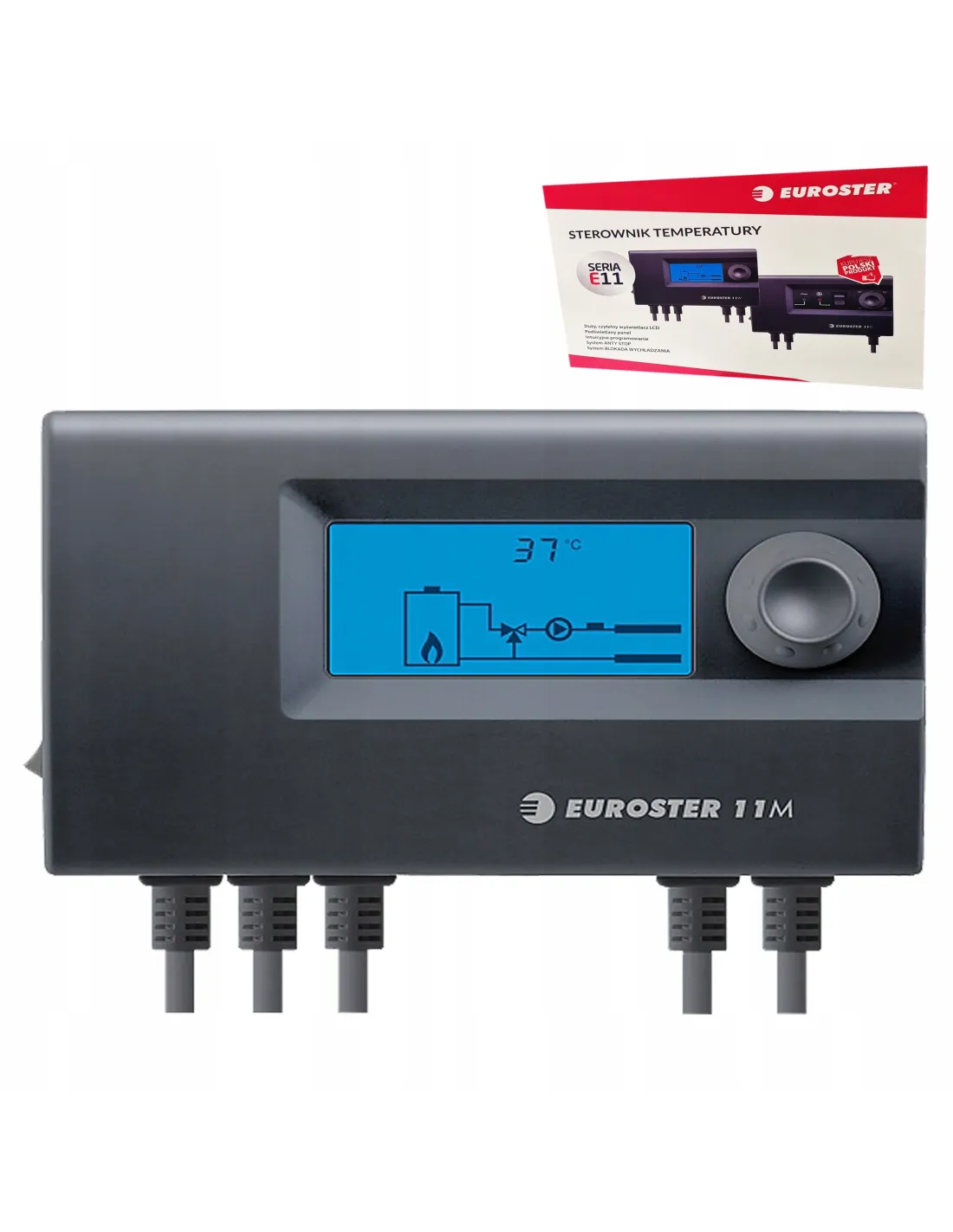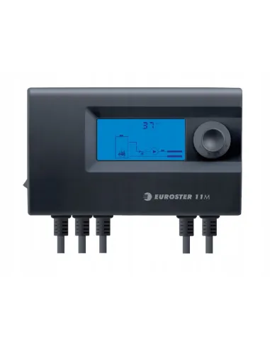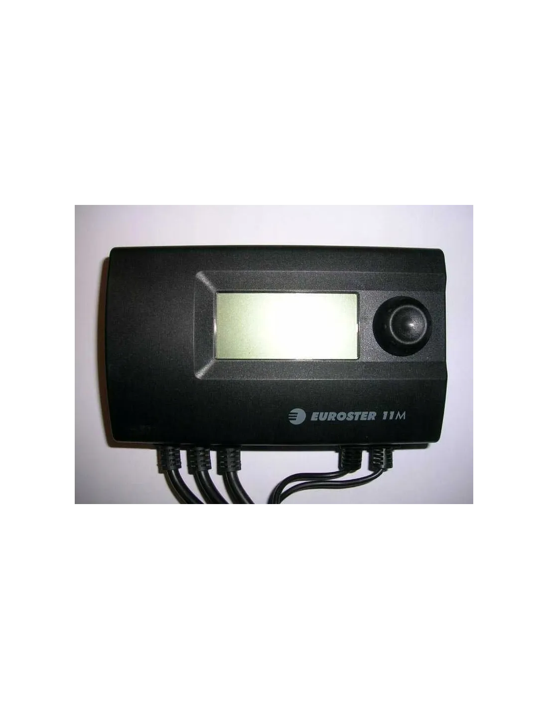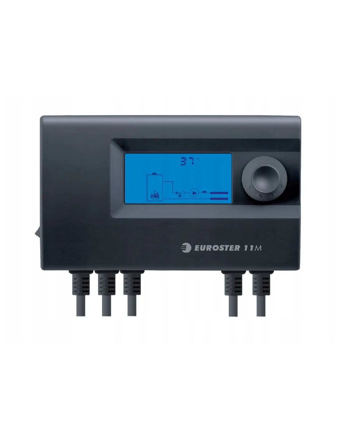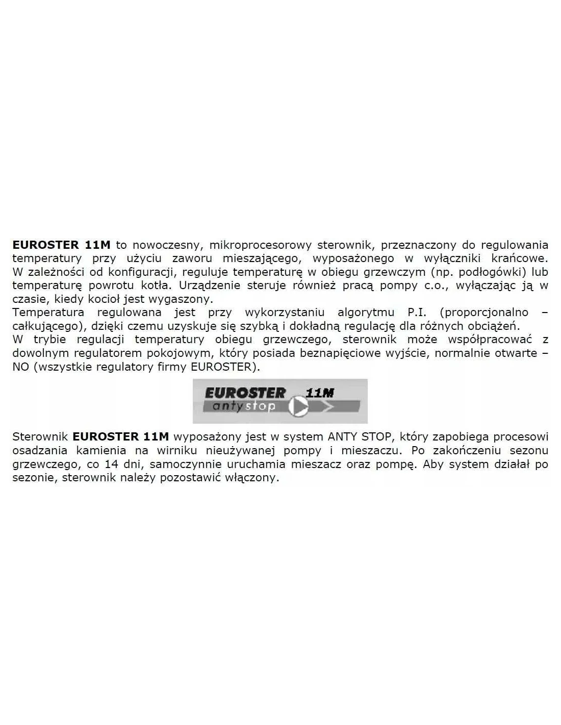 Euroster 11M to programowalny sterownik do współpracy z mieszaczem i siłownikiem oraz pompą obiegową c.o. W instalacji c.o. z kotłem węglowym sterownik automatycznie utrzymuje stałą temperaturę wody na zasilaniu lub steruje zaworem i utrzymuje stałą temperaturę wody na powrocie. Ustawienie optymalnej temperatury powrotu zapobiega zawilgoceniu kotła w trakcie rozgrzewania wody w c.o. oraz zwiększa jego żywotność. Funkcja sterownika wybierana jest programowo. W instalacji c.o. z kotłem węglowym regulator wyłącza pompę obiegową po wygaśnięciu płomienia w kotle. Euroster 11M posiada układ ochrony pompy przed zastaniem Anty Stop, który zapobiega procesowi zatarcia wirnika nieużywanej pompy. Po zakończeniu sezonu grzewczego, system co dwa tygodnie samoczynnie uruchamia pompę na 30 sekund (aby system działał po sezonie, sterownik należy pozostawić włączony).