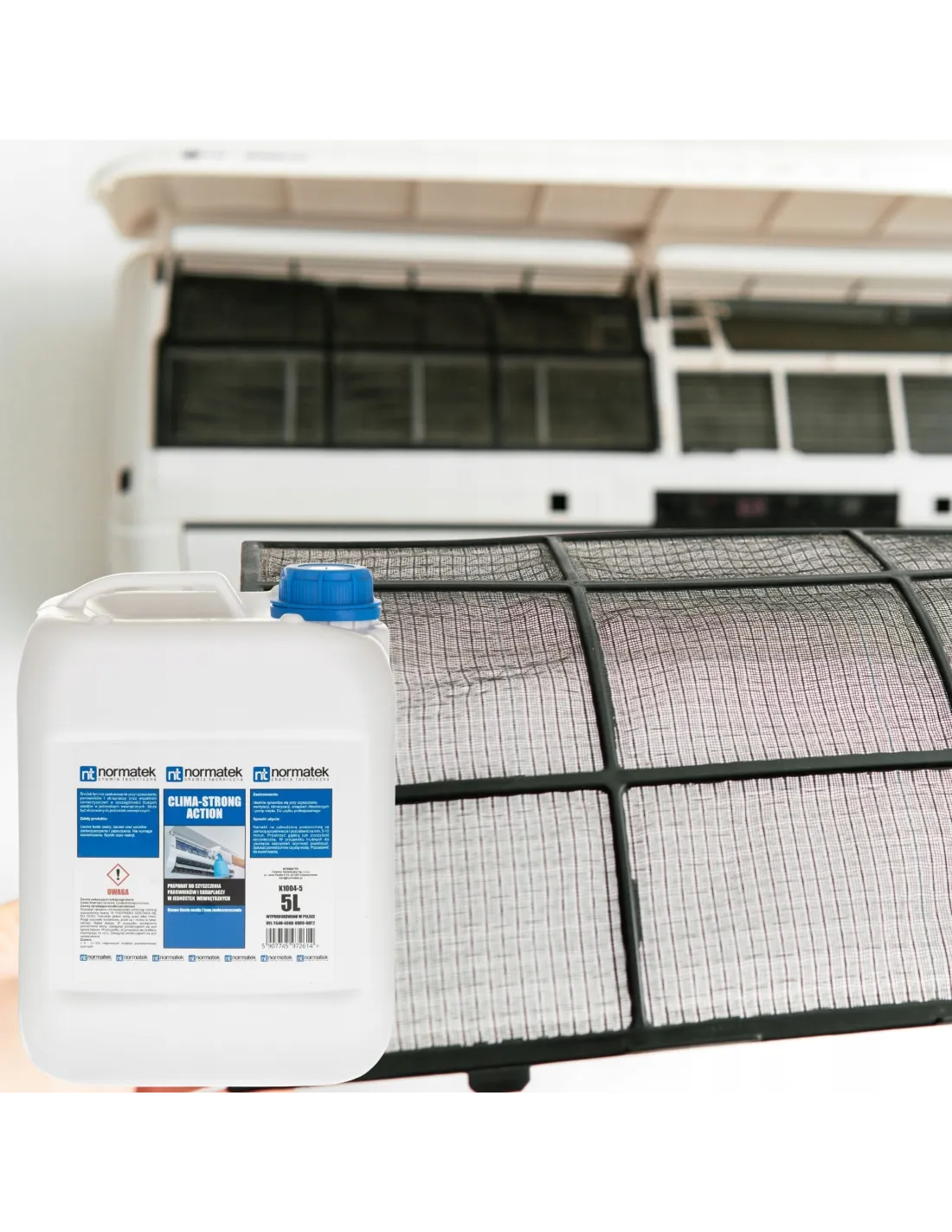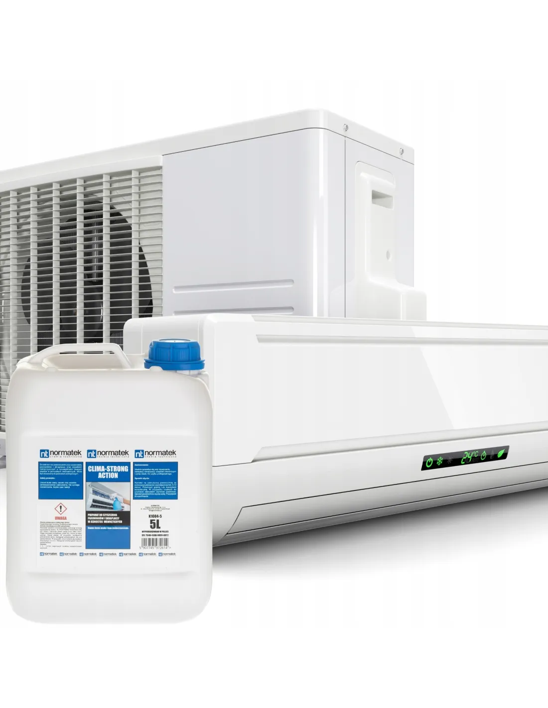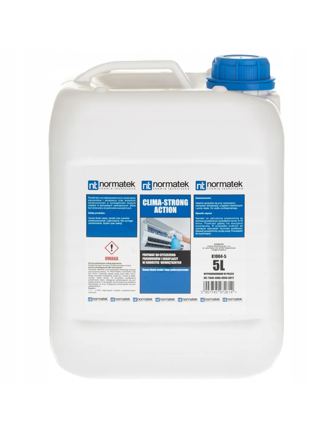 Normatek CLIMA STRONG ACTION 5L to zaawansowany preparat stworzony do skutecznego usuwania tłustych osadów, zacieków i uporczywych zabrudzeń z klimatyzacji, parowników oraz jednostek wewnętrznych i zewnętrznych.